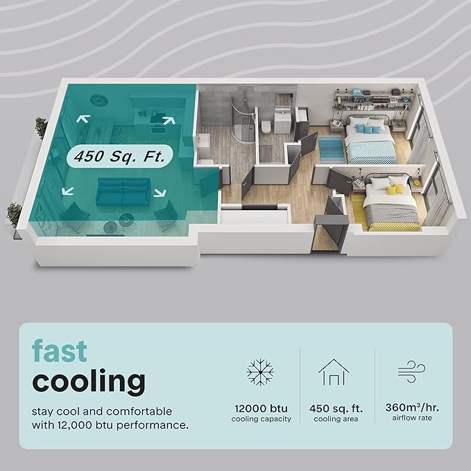 • 12,000 BTU COOLING POWER: With 1150W rated Power and 12000 BTU (ASHRAE) / 7,000 BTU (SACC) cooling power, the cold air can cover a room up to 550+ square feet; Air flow is rated at 290 M3/hr, moisture removal/dehumidifier at 1. 8 liters/hour