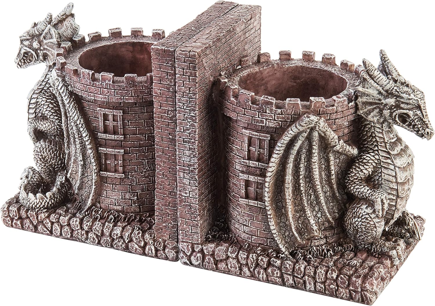 MyGift Dragon Guard Castle Resin Decorative Bookends for Heavy Books with Pencil Holders, Fantasy Themed Book Holder for Home and Office