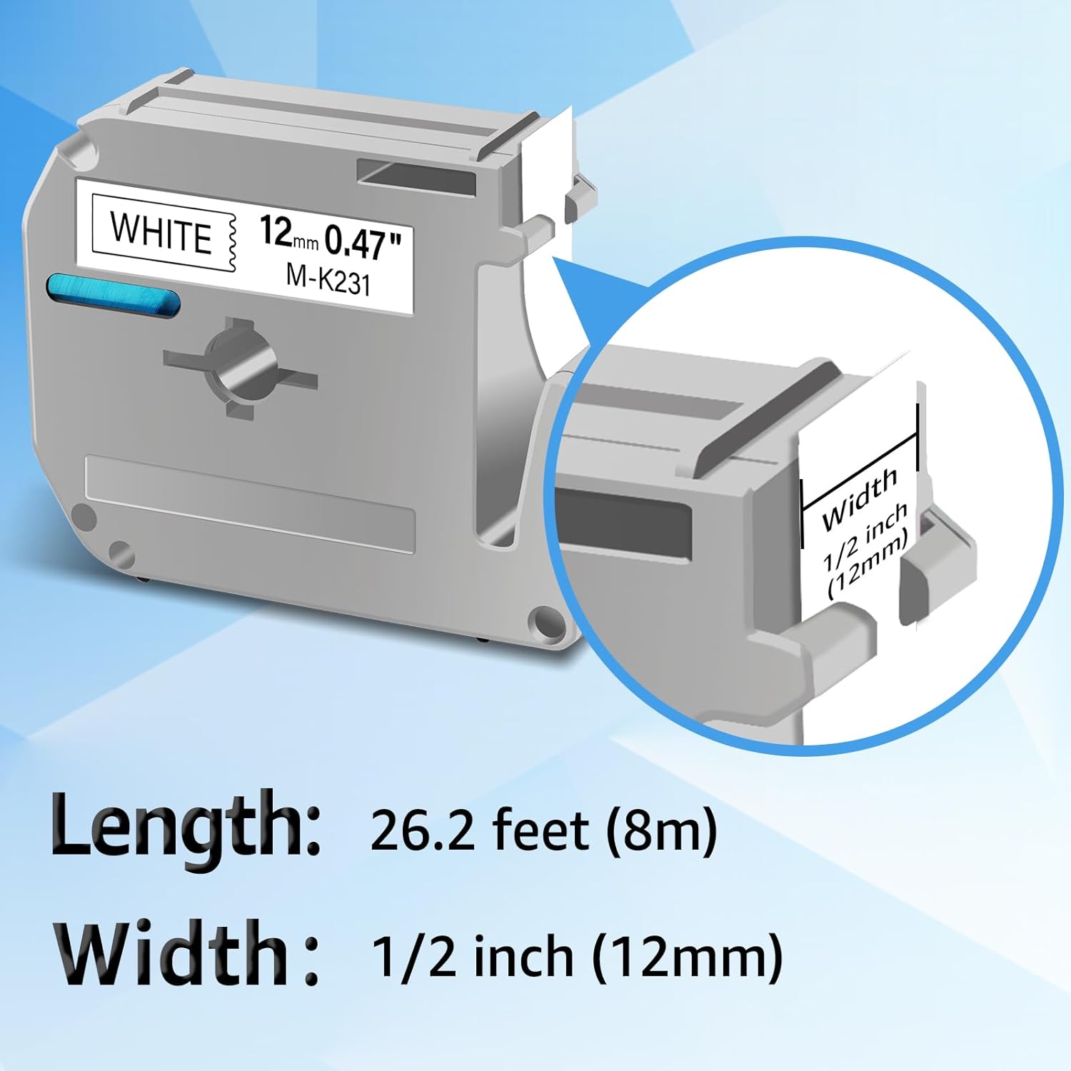 • Package includes: 1 pack compatible for brother p-touch mk231 m231 m-k231 m-k231s non-laminated label maker tape. Color: black ink on white tape. Width: 1/2 inch (12mm), length: 26.2 feet (8m).