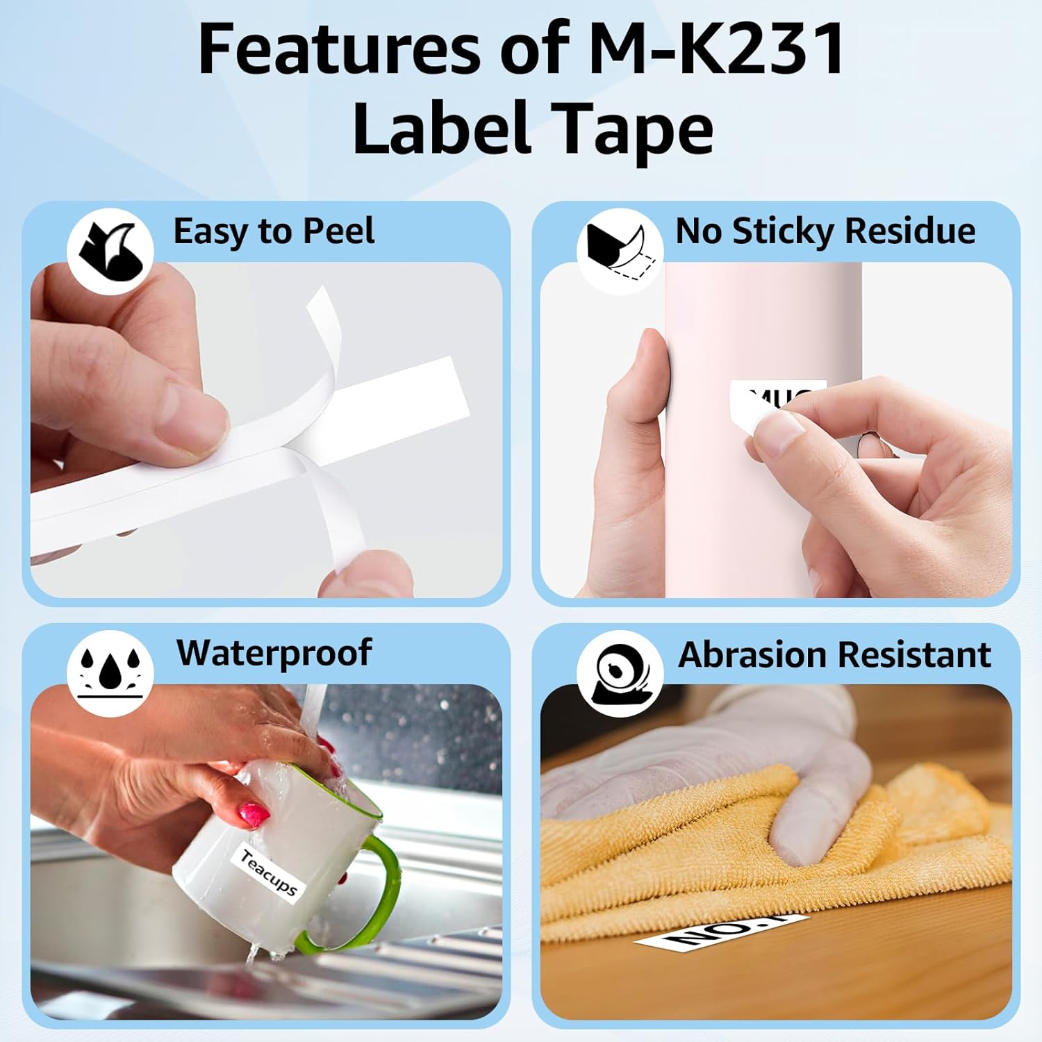 • Easy to install and use: ptouch m tape print crisp and bold text with those durable labels make identifying and labeling things easy and hassle free. The backing is split in two halves so is easy to peel and apply. Thermal labels: no ink or toner required!