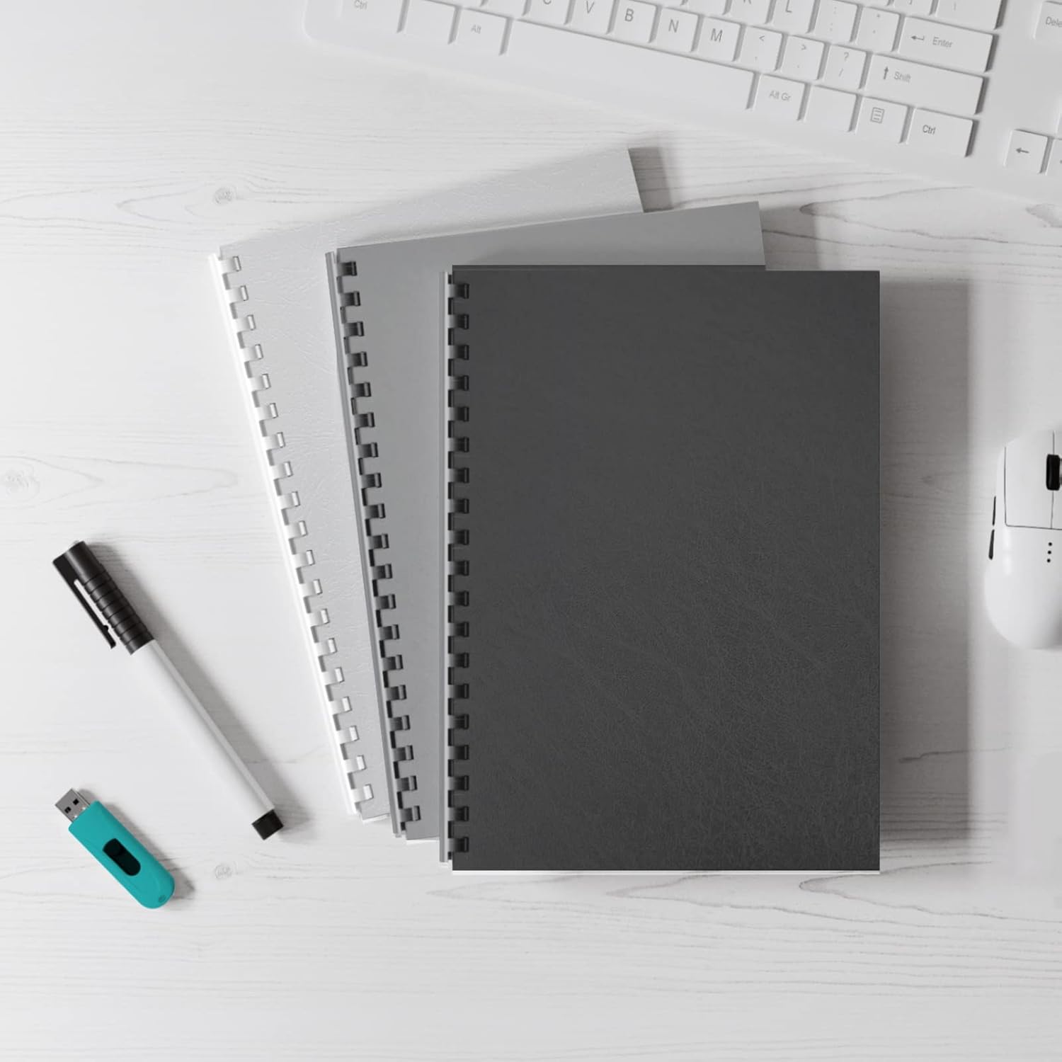• Sand & Leather Textured: Plastic binding back covers are designed with a leather-texture on one side, and a sand-texture on the reverse. (Attention: leather-like appear, not made from leather)