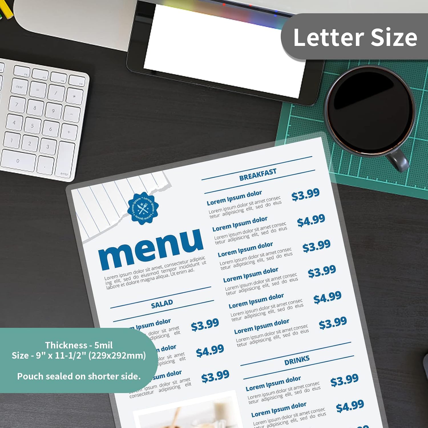 • 📄LETTER SIZE: Laminating Sheet Paper is 5 mil thickness, 9 x 11.5 inches, about 229 x 292mm. Fits letter size documents up to 8.5 x 11 inches. The thermal laminating pouches sealed on shorter side.