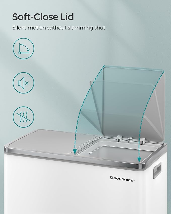 • [What You Get] A dual trash can sized at 23.2”L x 14.4”W x 25.6”H with 2 x 10.6-gallon compartments, 15 trash bags, plastic inner buckets, and a soft closure mechanism for easy waste disposal
