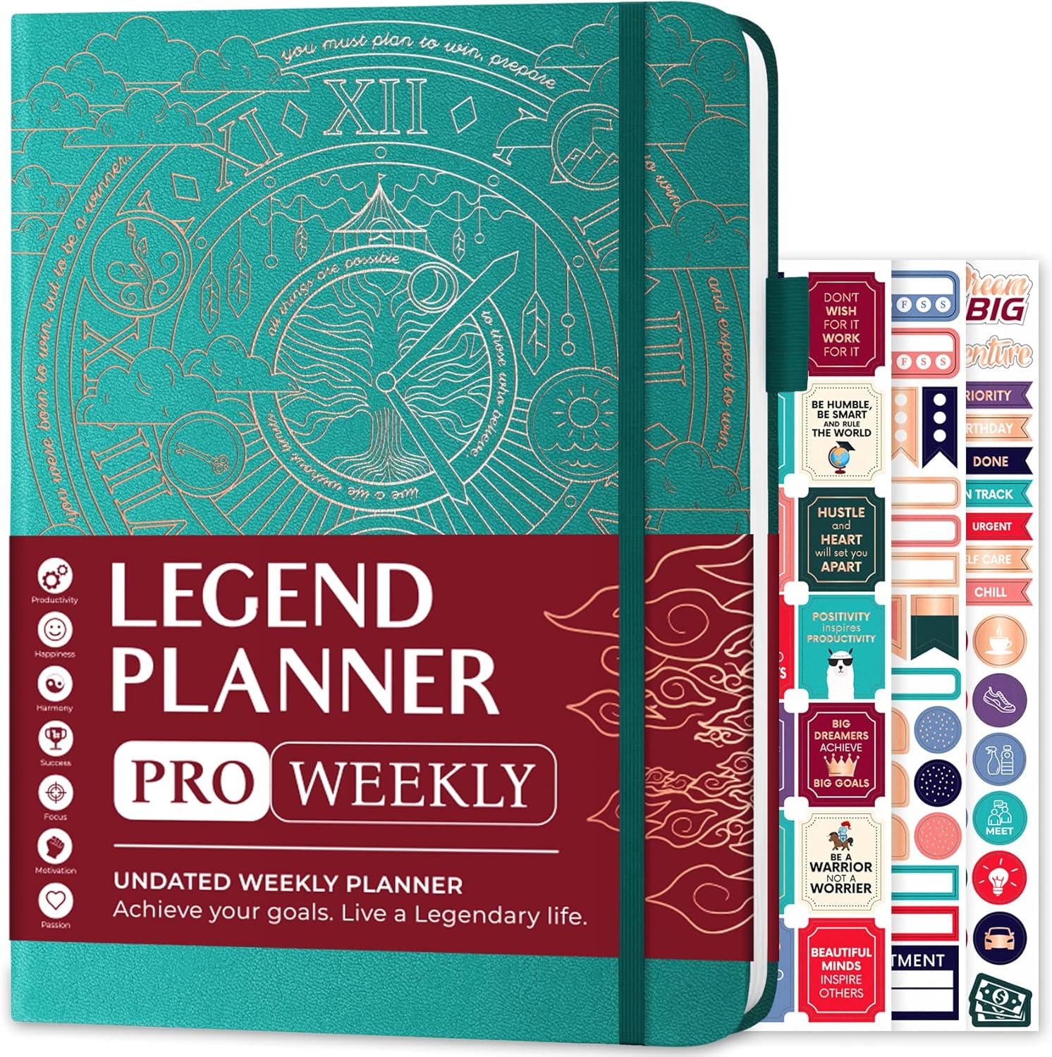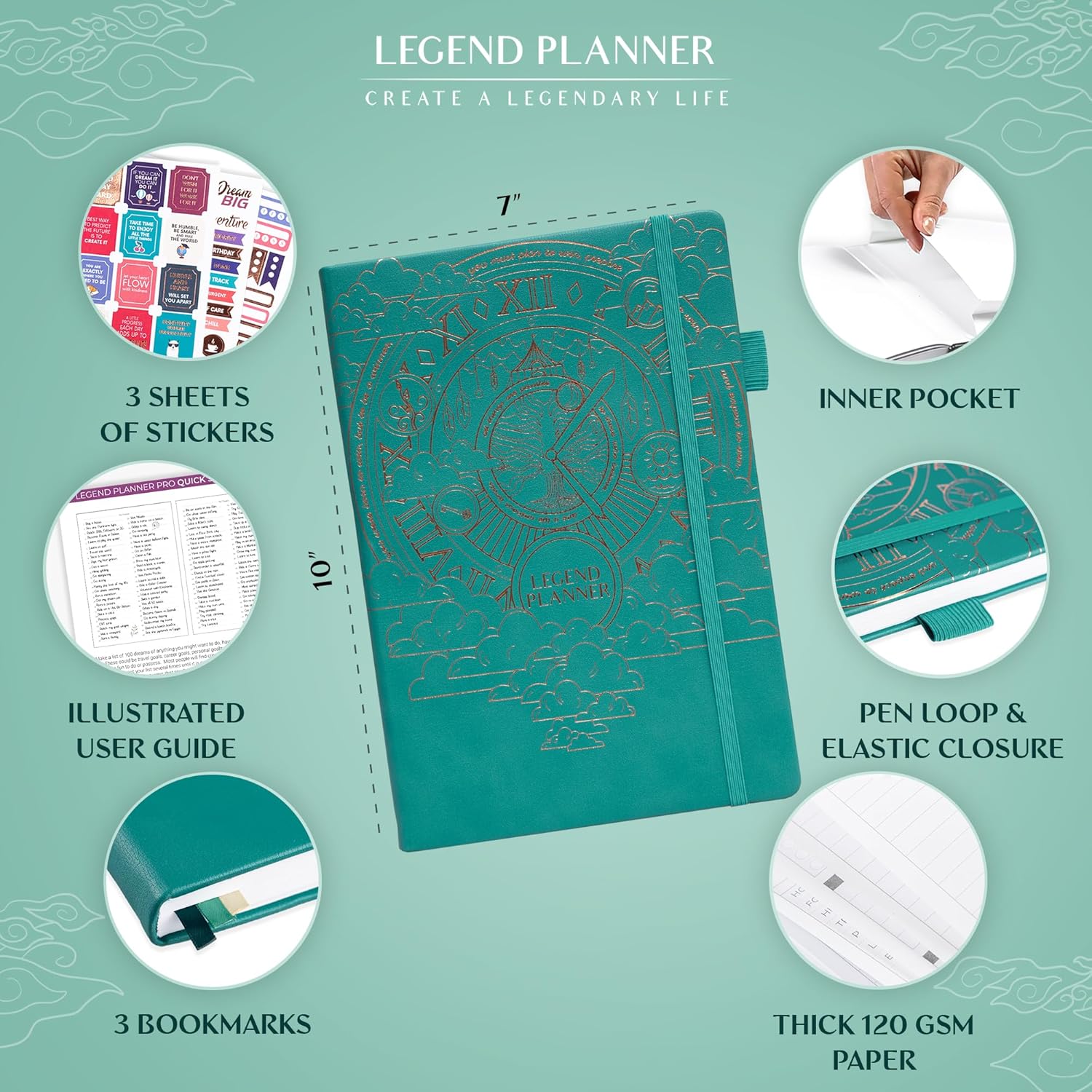 Legend Planner PRO – Deluxe Weekly & Monthly Life Planner to Increase Productivity and Hit Your Goals. Time Management Organizer Notebook – Undated – 7 x 10" Hardcover + Stickers – Viridian Green
