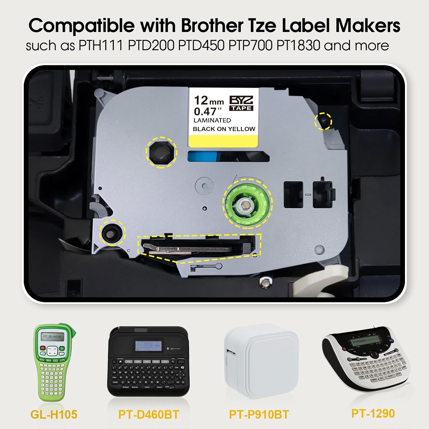 • Compatible with Brother P touch Label Makers: PTH110 PT-D210 PT-D400AD PT-H100 PT-D400 PT-P700 PT-D600 PT-1230PC PT-P300BT PT-P710BT PT-1890C PT-D600VP PT-1280 PT-2030 PT-1090 PT-1290 PT-D400VP PT-P750W PT2730VP PT-D450 PT-E500 PT-H500LI PT-D200 PT-1880C PT-1880W PT-H300LI PT-1880 PT-1800 PT-1830 PT-2730 PT-1010 PT-1890W PT-2430PC PT-9700PC PT-H300 PT-E100 PT-P950NW PT-P900W PT-P750WVP PT-E550W PT-2300 PT-9600, etc.