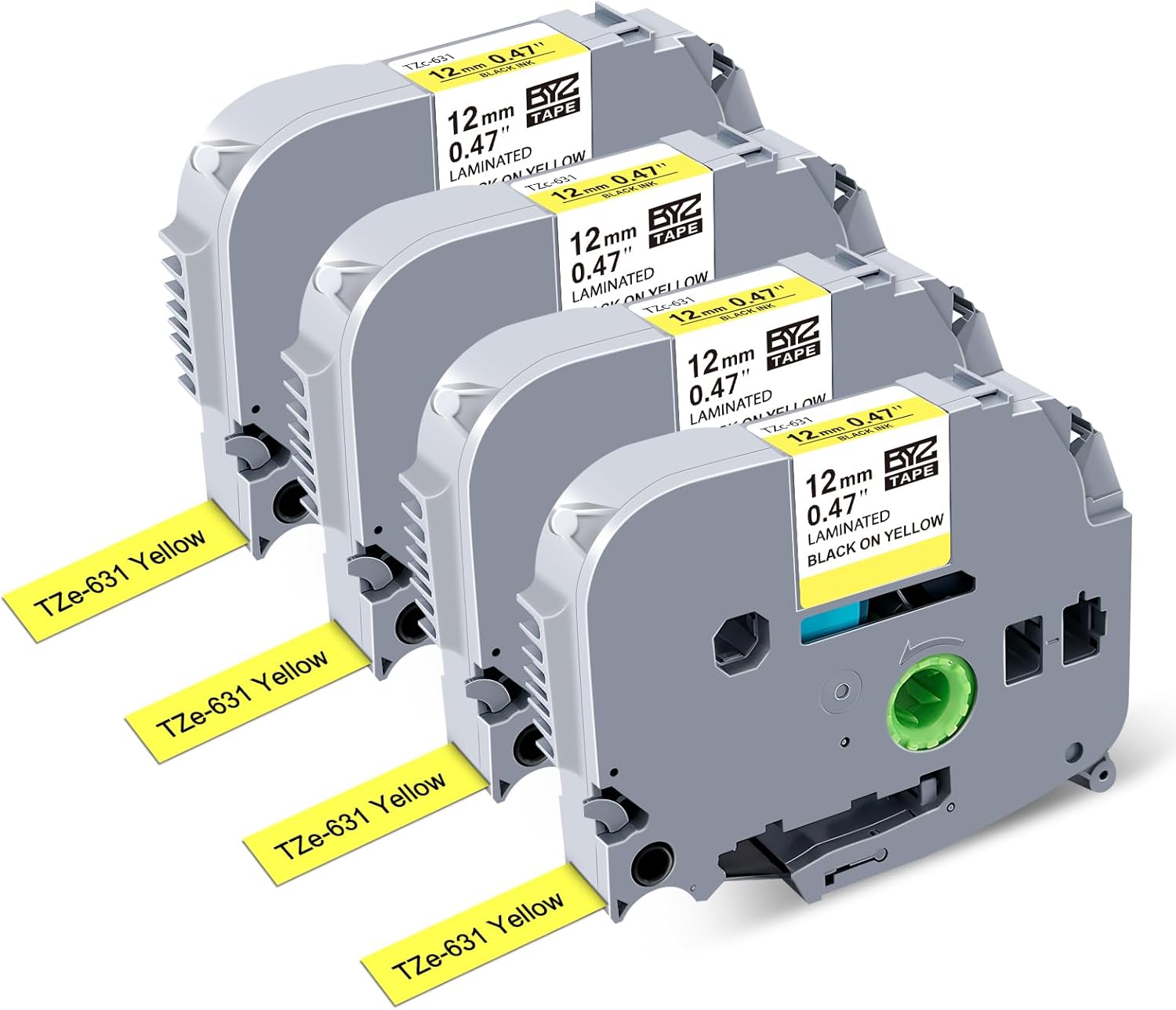 • 4Pack Compatible with Brother P Touch TZe-631 Label Maker Tape; Size: 1/2 Inch (12mm) Width, 26.2 Feet (8m) Length each pack; Color: Black Ink on Yellow Tape