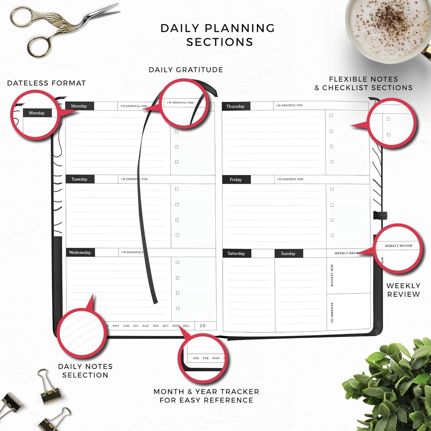 • ✅ VEGAN FRIENDLY, ELEGANT and ATTRACTIVE DESIGN - Our undated daily and monthly school planner would make a great gift for college students. Includes 3 silk bookmarks for multi-section planning, an elastic strap closure and an expandable inner back pocket.