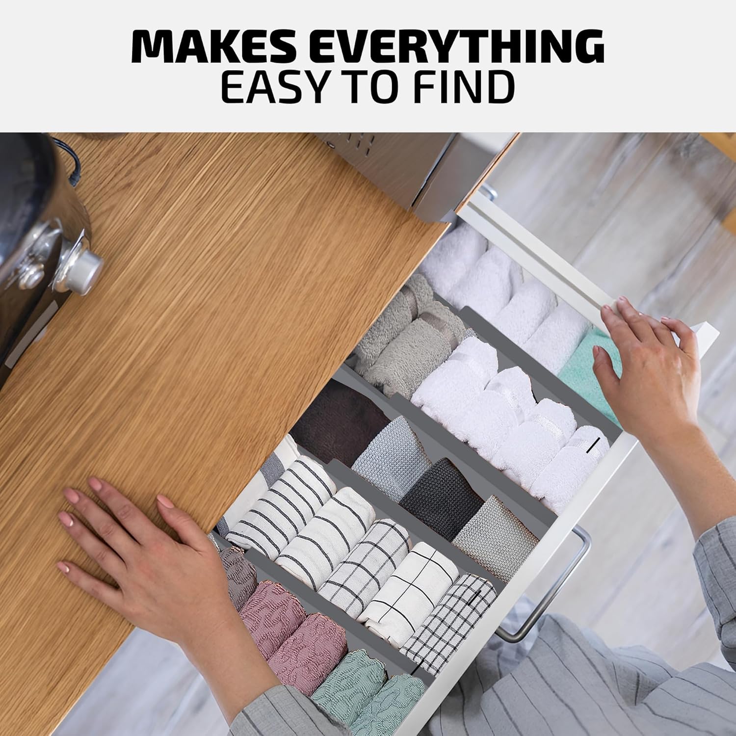• ✅ EASY & SECURE INSTALLATION: Quickly install these gray dividers without the need for tools. The strong, spring-loaded mechanism ensures they remain firmly in place, even with daily use. Additionally, the EVA foam at each end prevents slipping and protects your drawers from scratches or pressure damage, ensuring both stability and safety.