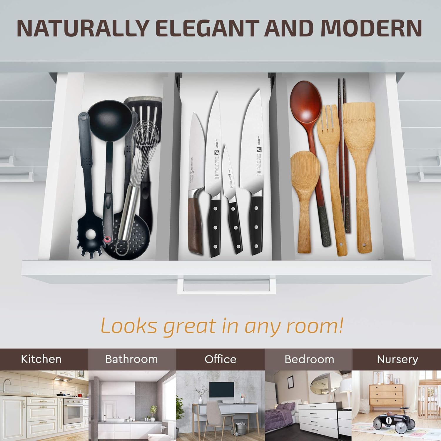 • ✅ MEASURE FOR PERFECT FIT: Ensure the size will work for your drawer by measuring your drawers before ordering. Our drawer dividers adjust from 16" to 22" and stand 2.6" high, making them perfect for both shallow and deep drawers. Available in four stylish colors—natural, white, grey, and black—they blend seamlessly into any décor.