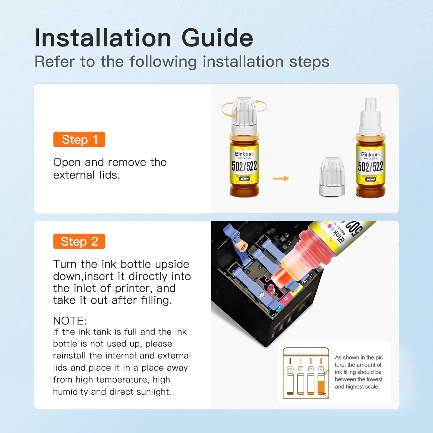 • Package Contents: 1 x Black 502 Ink Bottle, 1 x Cyan 502 Ink Bottle, 1 x Magenta 502 Ink Bottle, 1 x Yellow 502 Ink Bottle (Total 4 Pack)