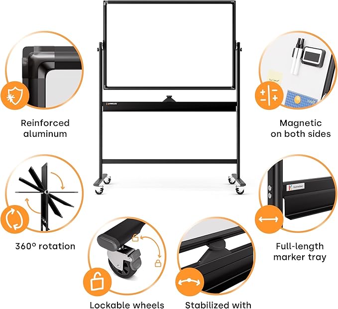 • Easy to Move and Adjust: Our mobile whiteboards feature Swing-Stop wheels and an easel frame that can be locked in place to maximize stability. The double-sided easel stand can easily flip to maximize whiteboard space and the dry erase boards feature magnetic surfaces, which allow you to easily organize accessories.