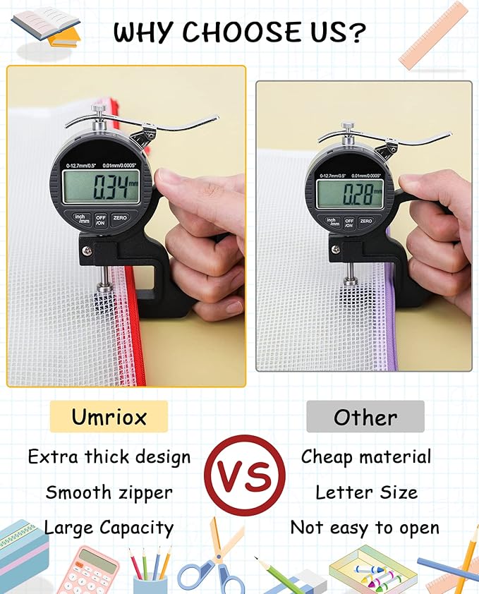 • Sturdy and Thickness Upgrade: Umriox zipper pouches are made of thickened PVC, waterproof and moisture resistant (except the zipper). The thickness is upgraded to 0.34mm, thicker than the average mesh zipper bags on the market