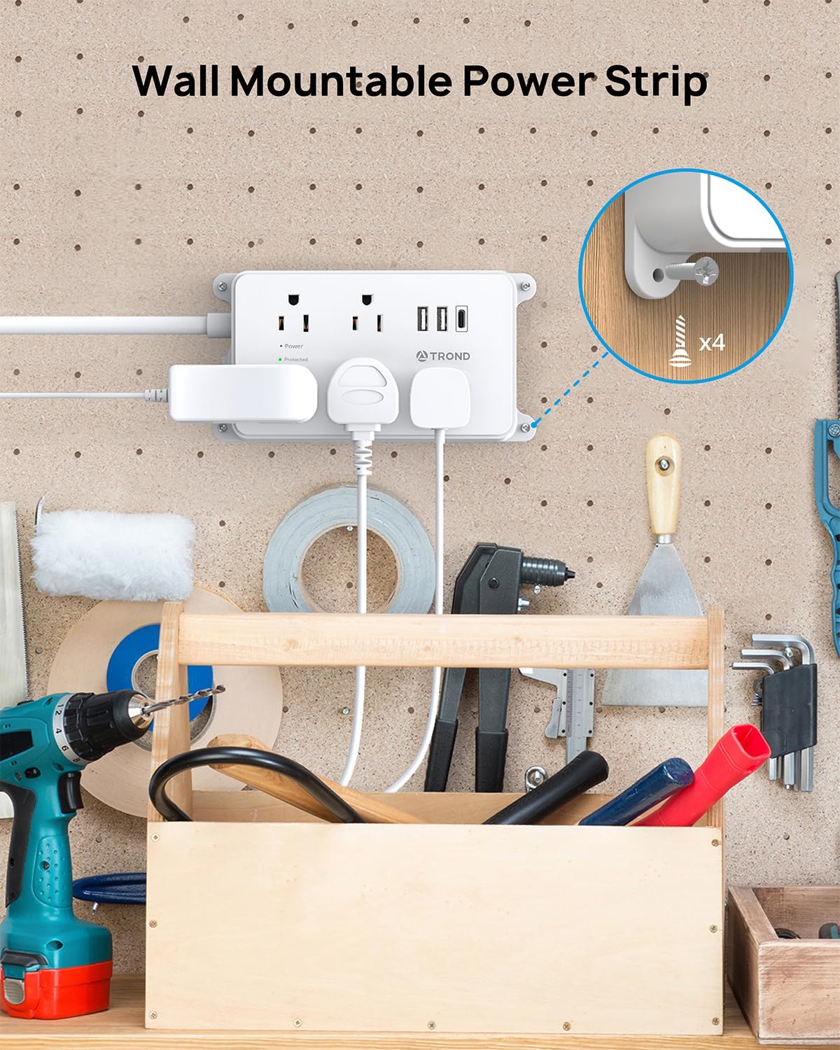 • Wall Mount Power Strip: This wall mountable power strip is a screw mountable design. Four screw-mounting tabs allow you to securely install this power strip and easily be reached, including behind the TV, workbench, garage, bedside, bathroom, laundry room, or under desk or cabinet, which is very low-profile and saves desktop space for you