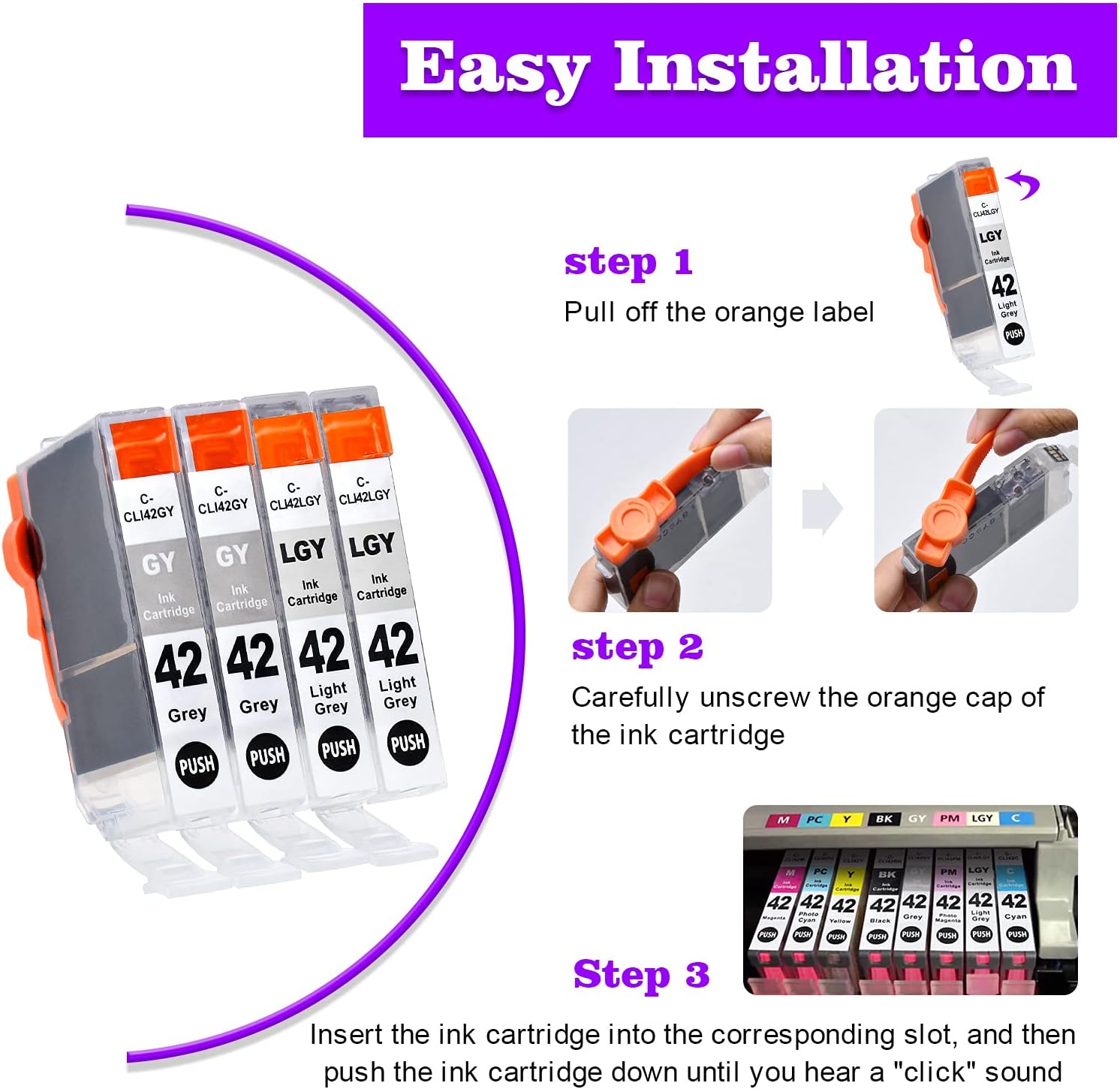 • Package Includes: 4 pack of CLI-42 compatible ink cartridges. 2x CLI-42 Gray, For 2x CLI-42 Light Gray