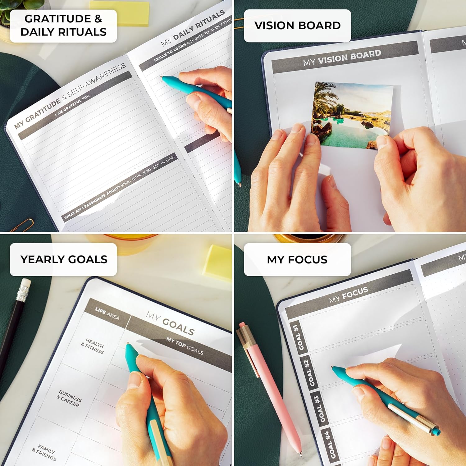 • DAILY, WEEKLY & MONTHLY PLANNING / REVIEW: Use detailed daily, weekly, and monthly planning pages to plan your agenda, set goals, and track habits. The planning notebook also has weekly reviews will regularly evaluate your progress.