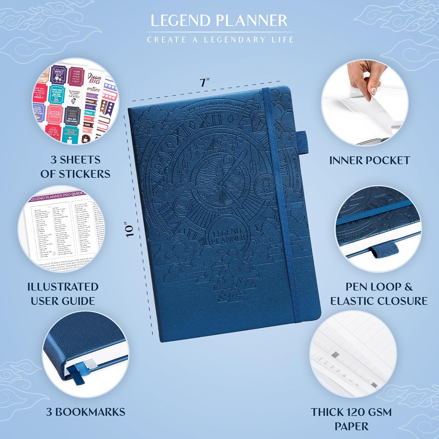 Legend Planner PRO – Deluxe Weekly & Monthly Life Planner to Increase Productivity and Hit Your Goals. Time Management Organizer Notebook – Undated – 7 x 10" Hardcover + Stickers – Mystic Blue