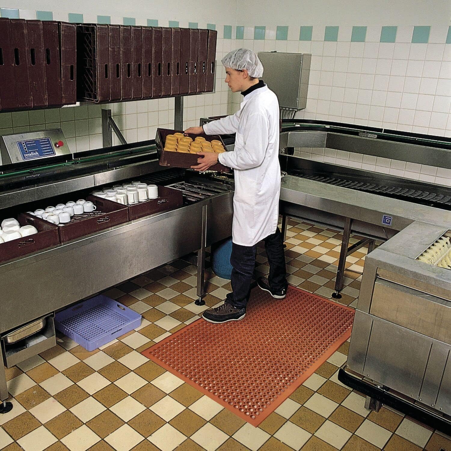 • Increased Workplace Safety - Our anti-fatigue rubber matting with molded-in beveled edges provides a smooth transition from the mat to the floor, ideal for use as commercial kitchen mats