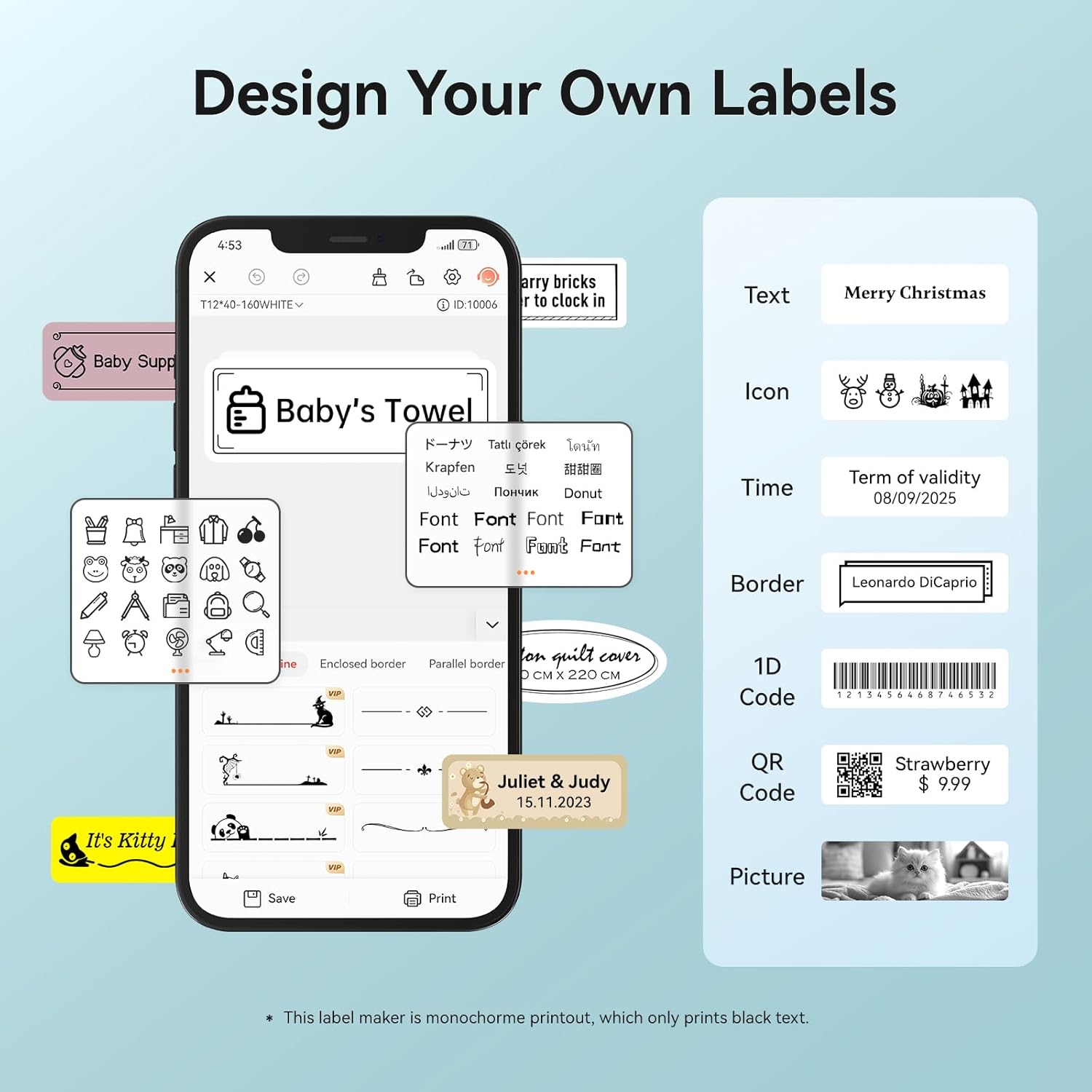 • 【Powerful Functions】It is support to print various texts, numbers, graphics, symbols, logos, barcodes, QR codes,etc. And intelligent recognition of voices and pictures.