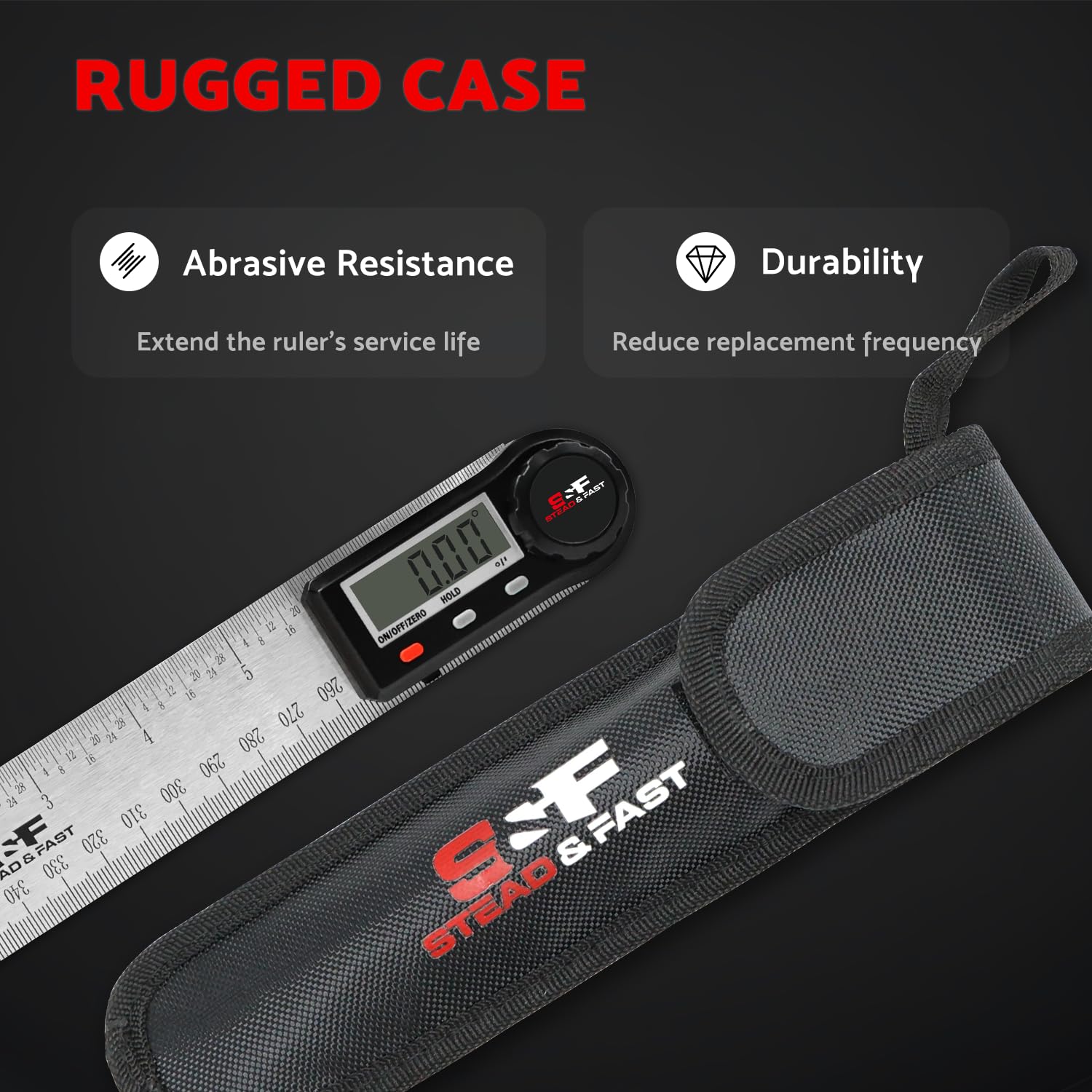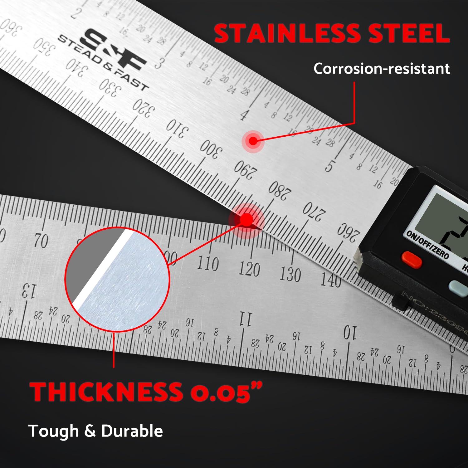 • Durability: Angle finder tool digital made from high tensile strength stainless steel with an etched scale; this ruler withstands frequent use and maintains high precision in harsher environments with corrosion resistance superior to that of aluminum