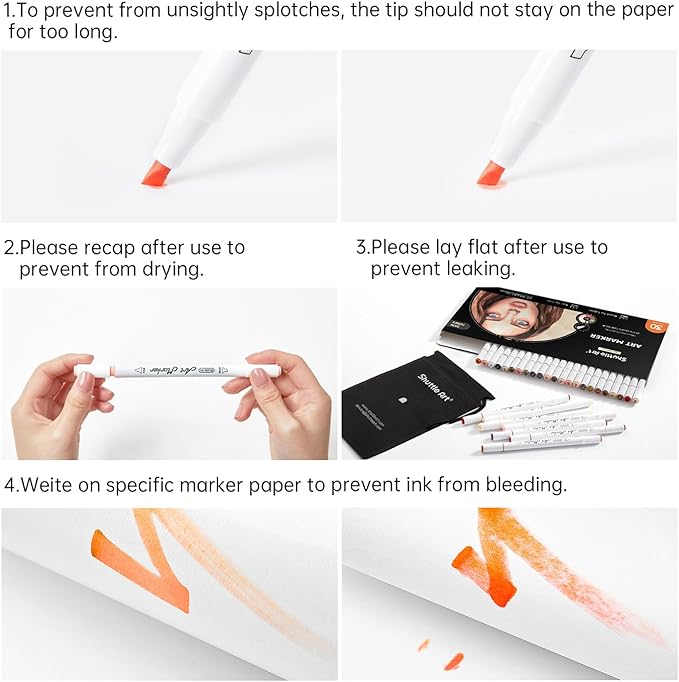 • CAUTIONS:The marker set is non-toxic and acid-free, safe for kids and students, conforming to ASTM-D4236. In order to prevent the ink bleeding in use, the tip should not stay on the paper for a long time. Markers need to write on a specific mark paper so that it doesn't bleed to the next layer. To prevent the marker from drying and ink leaking, please recap and keep the marker laid flat after use.