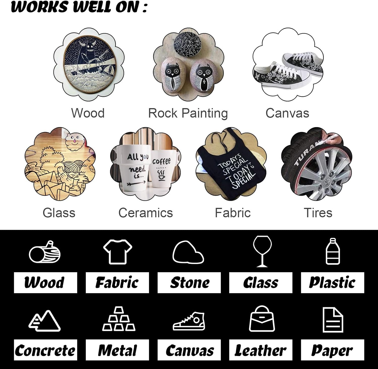 • 【Mark on dark and light color surfaces】Contrast color is very eye-catching, suitable for leave message and sign. Suitable for leave message and permanent sign. Paint markers for rocks painting, fabric, ceramic, glass, wood, plastic, leather, canvas, mugs, blackboard almost any solid surface.