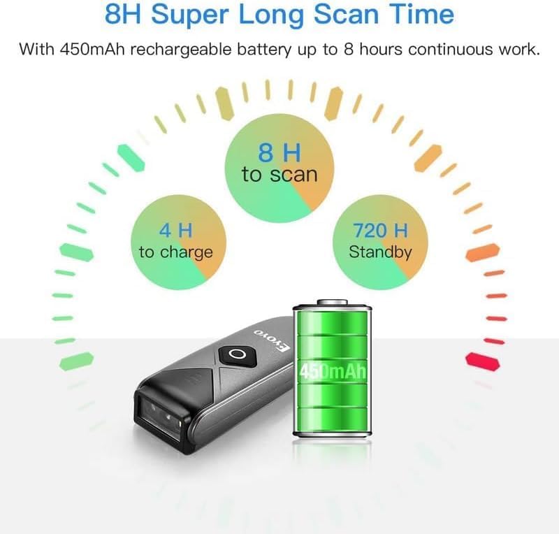 • Long-Lasting Rechargeable Battery & Energy Saving Design: Our upgraded wireless Bluetooth barcode scanner is equipped with a rechargeable battery, it can work continuously for 8 hours, a 180-day super long standby time. To save power, the scanner will automatically shut down after 5 minutes of no operation by default, users can set or cancel the shutdown time