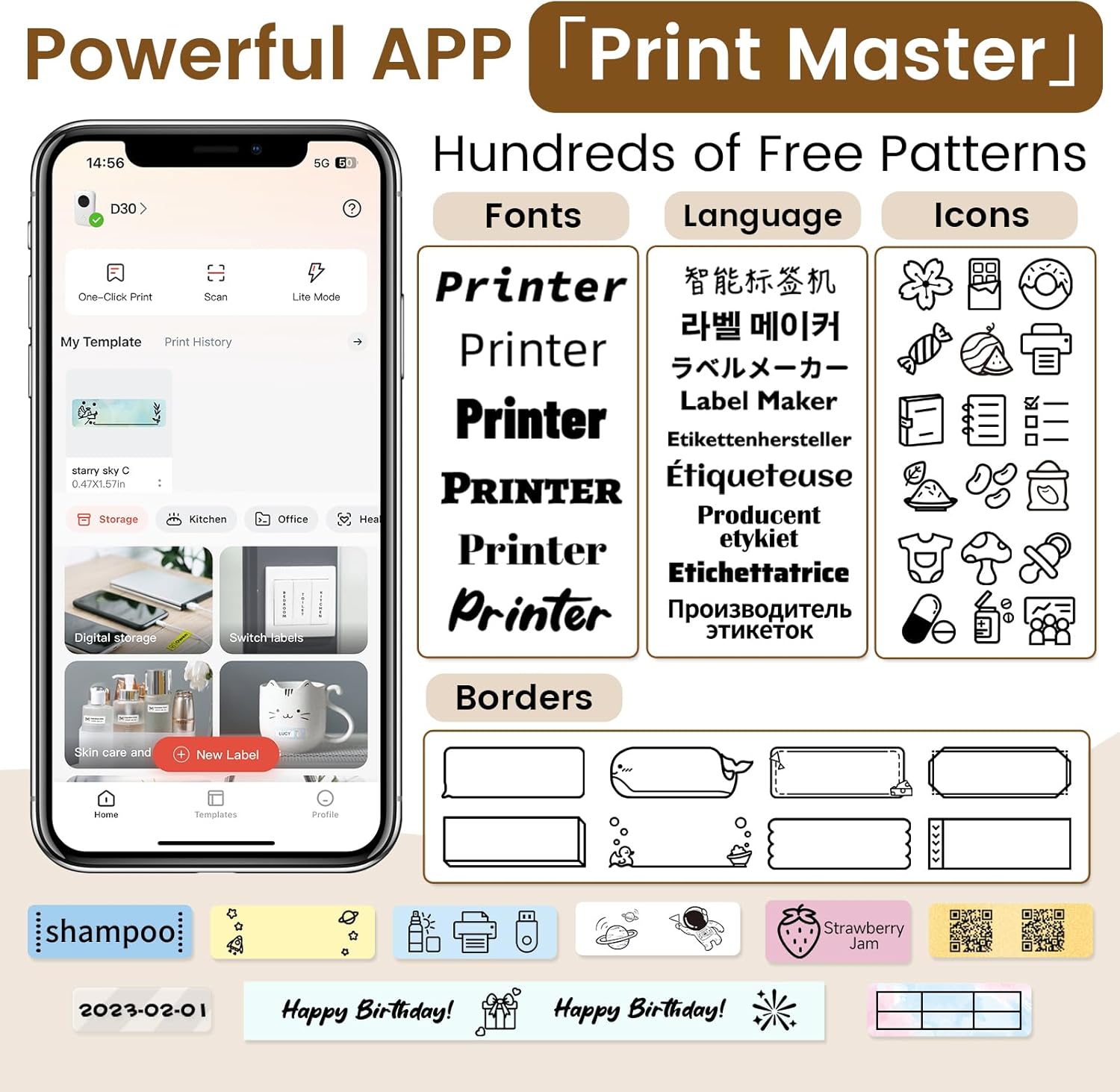 • Save Money with Thermal Technology - The D30 Bluetooth label maker uses inkless printing and doesn’t require ink, toner, or ribbons. With many colorful thermal label tapes to choose from, the overall cost is much lower compared to most label makers. (This label maker only produces black text. To create color label designs, use color-patterned label tapes.)