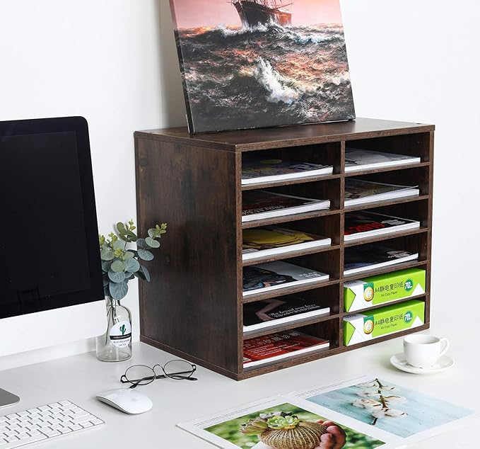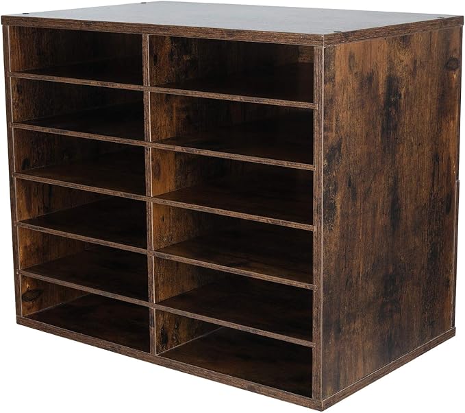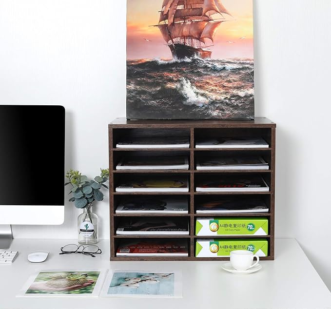 • 12-Compartment Mail Sorter Organizer: Hold 500+ A4 paper sheets in each compartment in this mail organizer. With 12 compartments (12 x 9 x 2.1 inch eash slots), store comics, magazines, and travel brochures effortlessly. EPA-certified particleboard ensures long-term durability for office/classroom use.