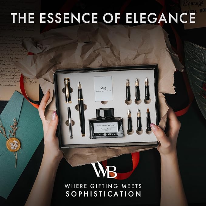 Wordsworth & Black Calligraphy Pen Gift Set, Includes Bottle, 6 Cartridges, Refill Converter, 6 Replacement Nibs, Premium Package, Journaling, Smooth Writing Pens [Black Gold]