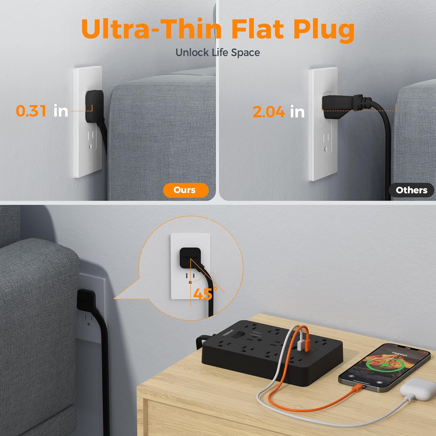Surge Protector Power Strip Black, TESSAN Flat Plug Extension Cord 10 FT with 10 Widely AC Outlets 3 USB(1 USB C), 1700J Protection Multi Plug Charging Station for Home, Office, College Dorm Room