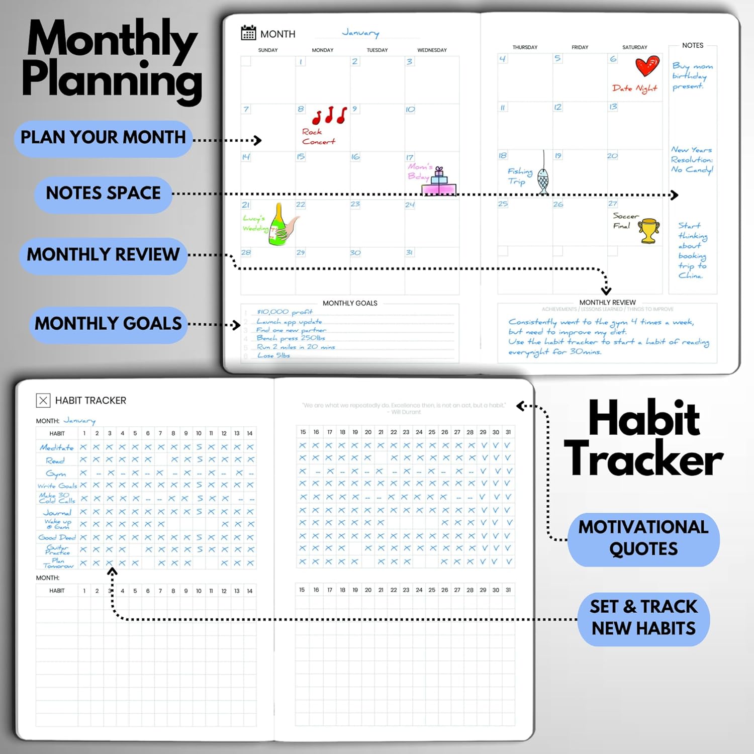 • STAY ALIGNED WITH YOUR GOALS – Use built-in goal-setting tools and review prompts to stay focused on long-term success—whether you’re managing business milestones, career growth, or personal development.