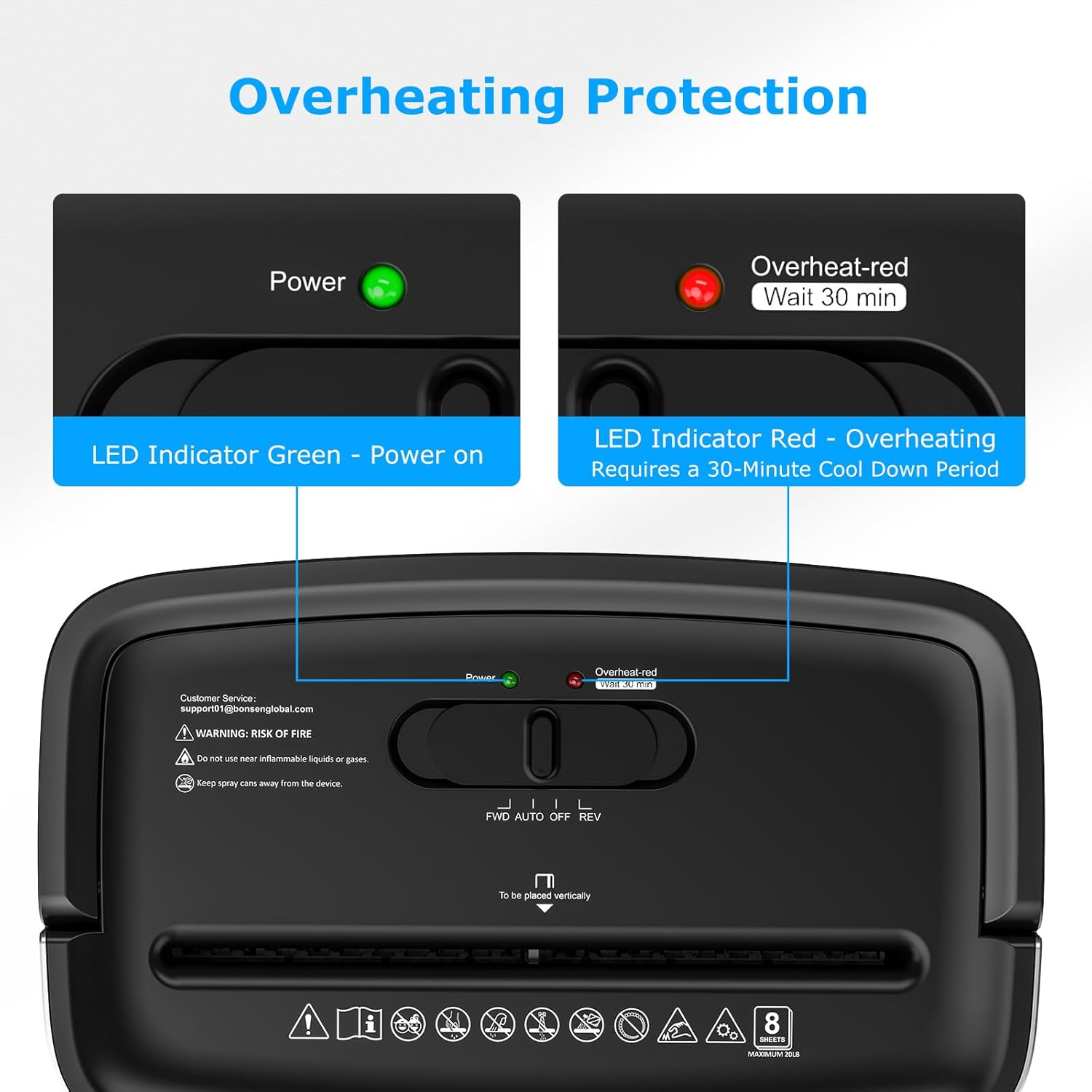 • Overheating Protection & Anti-Jam System: 4 mode control switch (Forward, Auto, Off, Reverse) and LED light indicators (Power On, Overheat); Overheating (Red Light On) protection makes it safer to use; Anti-jam system helps to clear paper jams