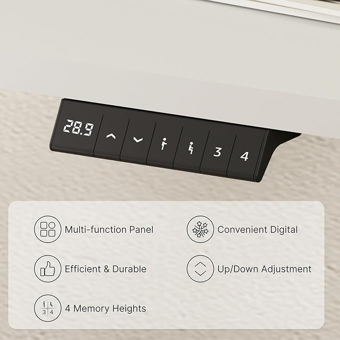 • 4 MEMORY BUTTONS: Easily switch between sitting and standing positions with our 6-button digital controller that features 4 programmable memory presets. The motorized height-adjustable system adjusts smoothly from 28.1” to 45.7”, and the motor runs quietly at less than 50 dB.