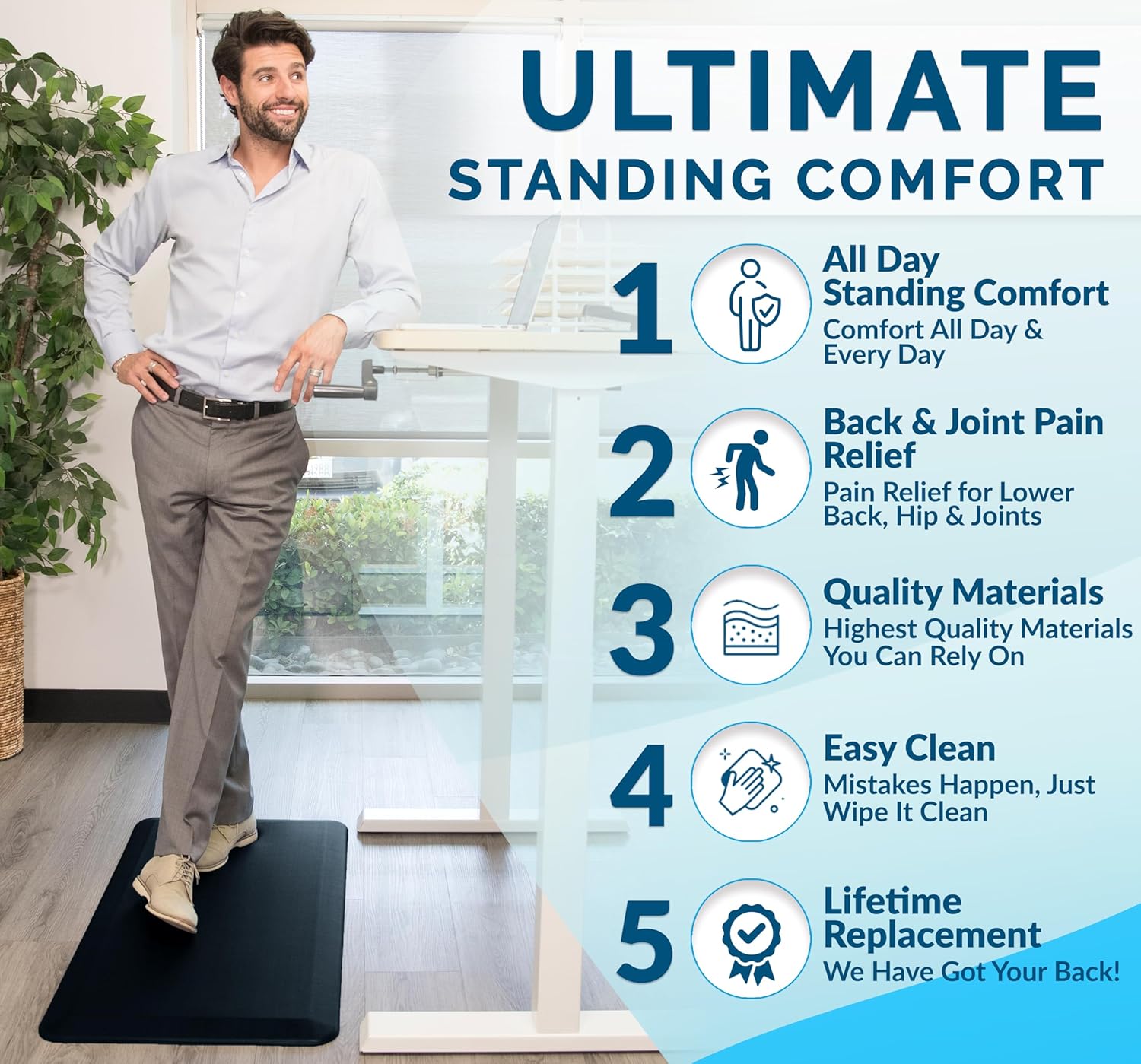 • Multi-use Floor Mat: The ComfiLife standing pad is exceptional for your office while standing at your desk, the kitchen while doing dishes, the laundry room while folding clothes and while working at your workbench. This kitchen rug will add comfort and style to your kitchen and provide lasting comfort and enhanced productivity wherever you stand.