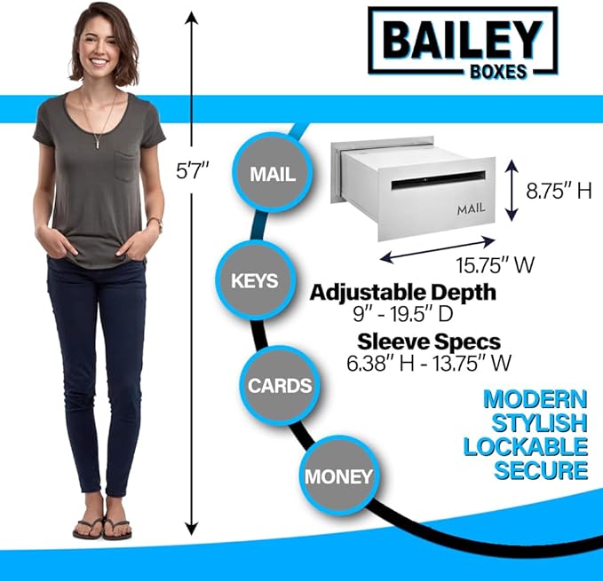 Brick-in Chute Through The Wall Stainless Steel Mailbox - Modern Architectural Locking Design - 8.75" H x 15.75" W - Enhance Your Home with The Melton from Bailey Boxes