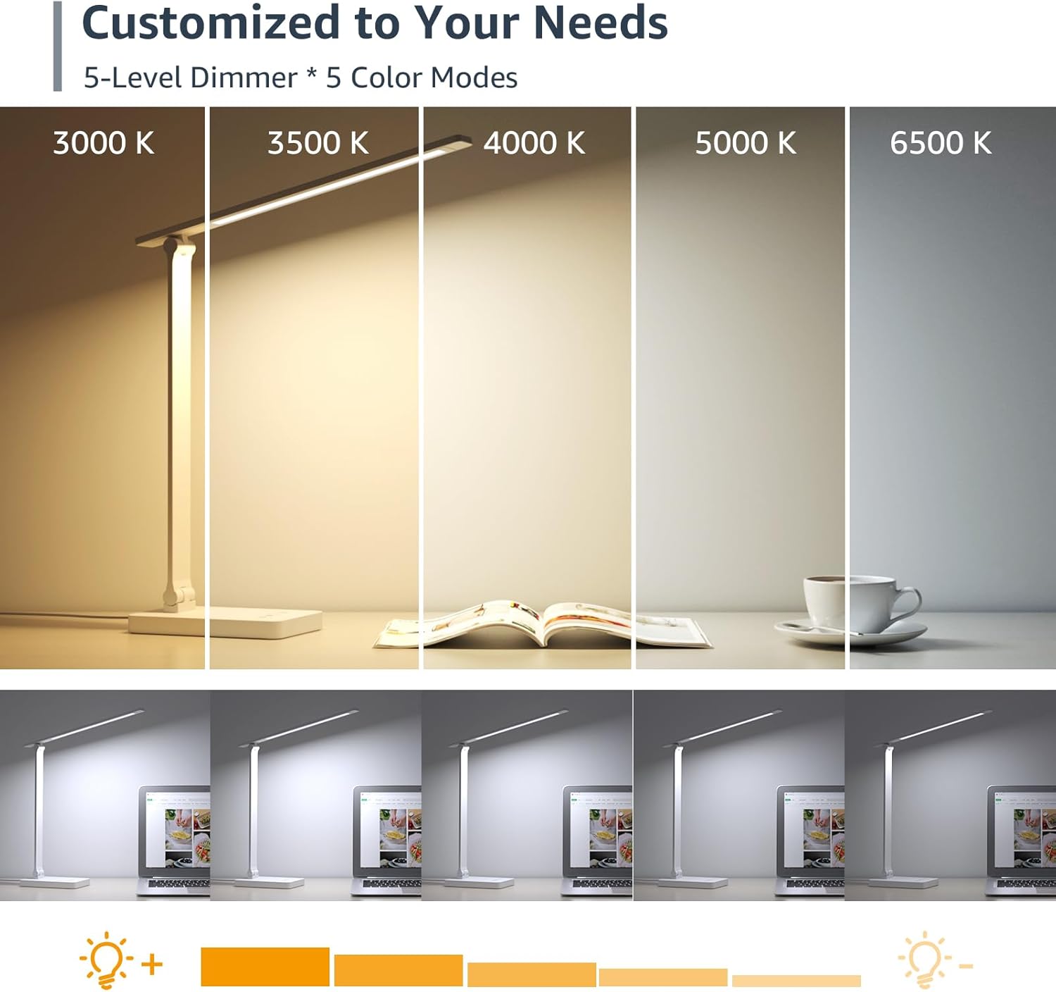 • [Multiple Lighting Choices] - This LED desktop lamp offers 5 lighting modes, each of which can be paired with one of 5 brightness levels, making it suitable for various needs, from bright white light for home office work to soft warm light for bedside reading.