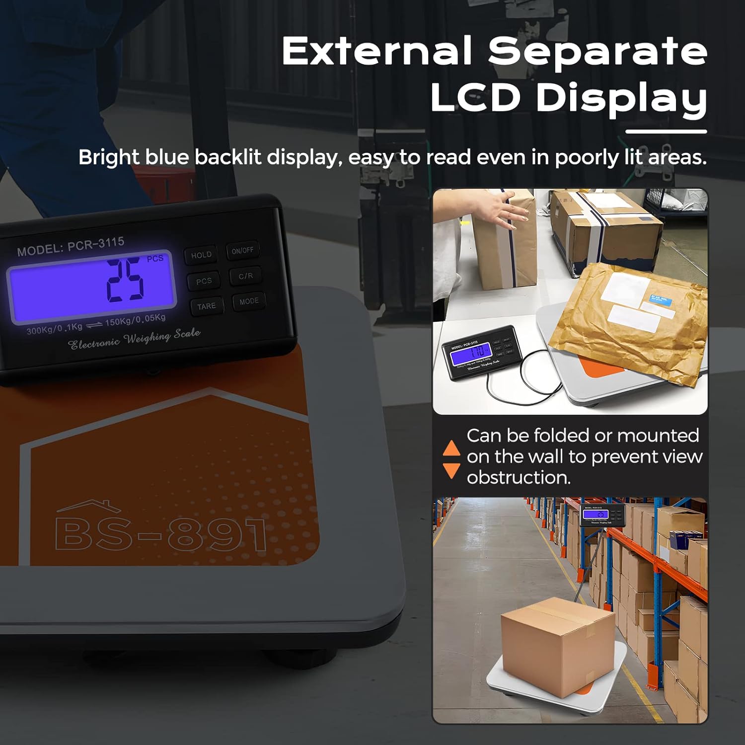 Bonvoisin Postal Scale Digital 300kg/ 660lb Parcel Shipping Scale kg/oz/lb Switchable, Heavy Duty Package Scale for Weighing Boxes/Luggage with Stainless Steel Platform 4 AA Batteries & Power Adapter