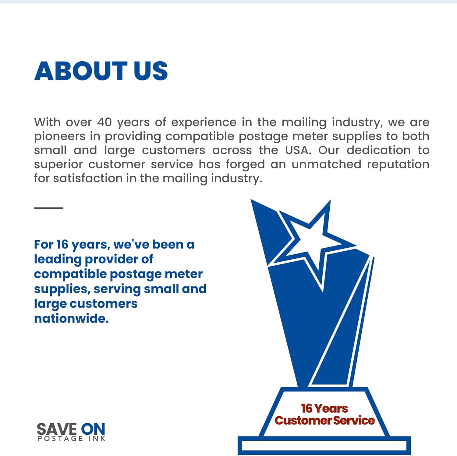 • ABOUT US - SAVE ON POSTAGE INK: Our company is a postage meter supply market leader which sells postage meter supplies all over the United states. We have over 36 years of experience in the mailing industry & our main focus is our commitment to superior service and customer satisfaction has helped us establish an unequaled reputation within the mailing industry.