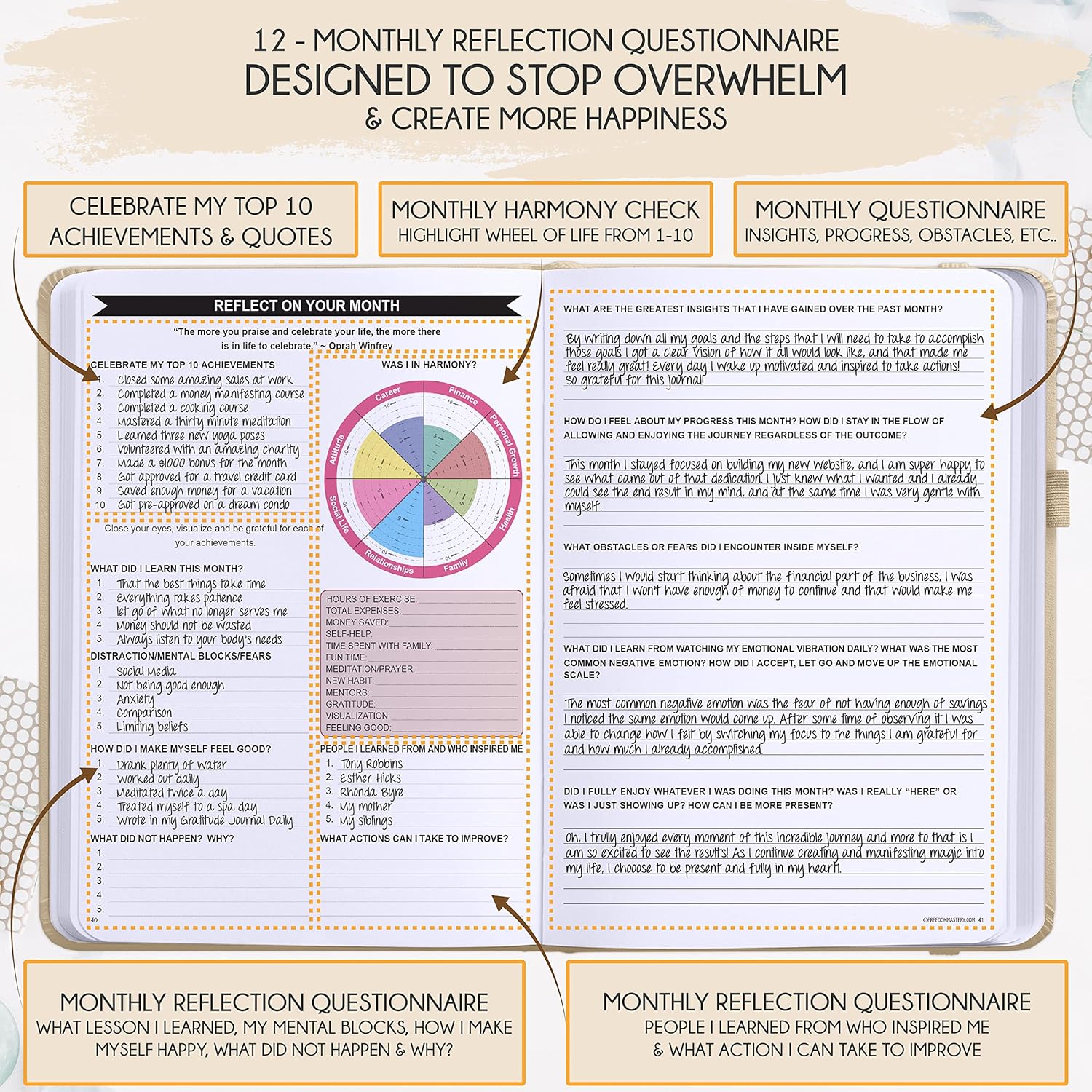 • INCREASE PRODUCTIVITY AND HAPPINESS - This is a deluxe life goal planner showing you how to become the best possible version of yourself on a mental, physical & interpersonal level using the law of attraction vibration guide. This planner is a daily planner, monthly planner, weekly planner, productivity planner, goal planner, business planner, to do list planner, planner notebook & gratitude journal all-in-one.