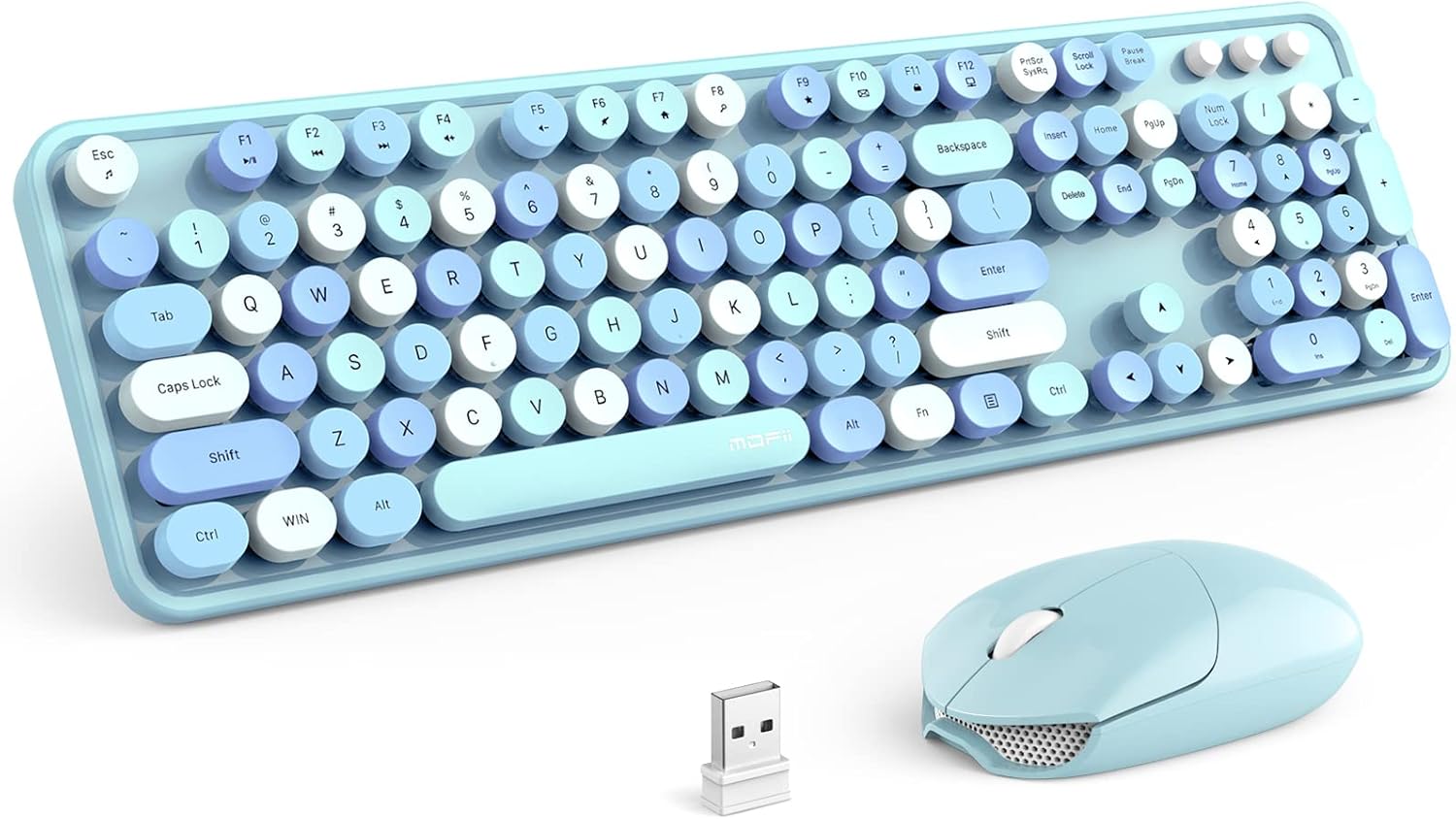MOFII Wireless Keyboard and Mouse Combo, Retro Wireless Keyboard with Round Keycaps, 2.4GHz Dropout-Free Connection, Cute Wireless Mouse for PC/Laptop/Mac/Windows XP/7/8/10 (Blue-Colorful)