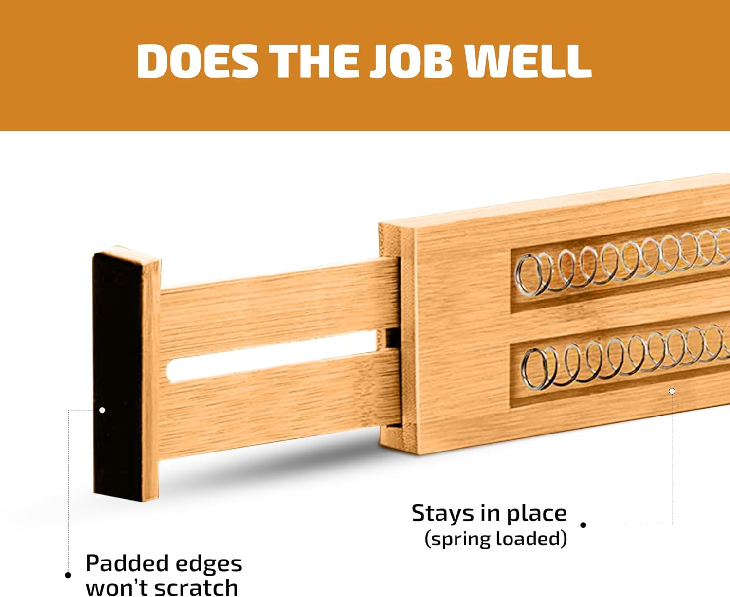 • STRONG SPRING: The drawer separators really bring organization into your home, because they don’t wobble or move out of place. With the spring mechanism and foam padding, the wood dividers stay firmly in place.