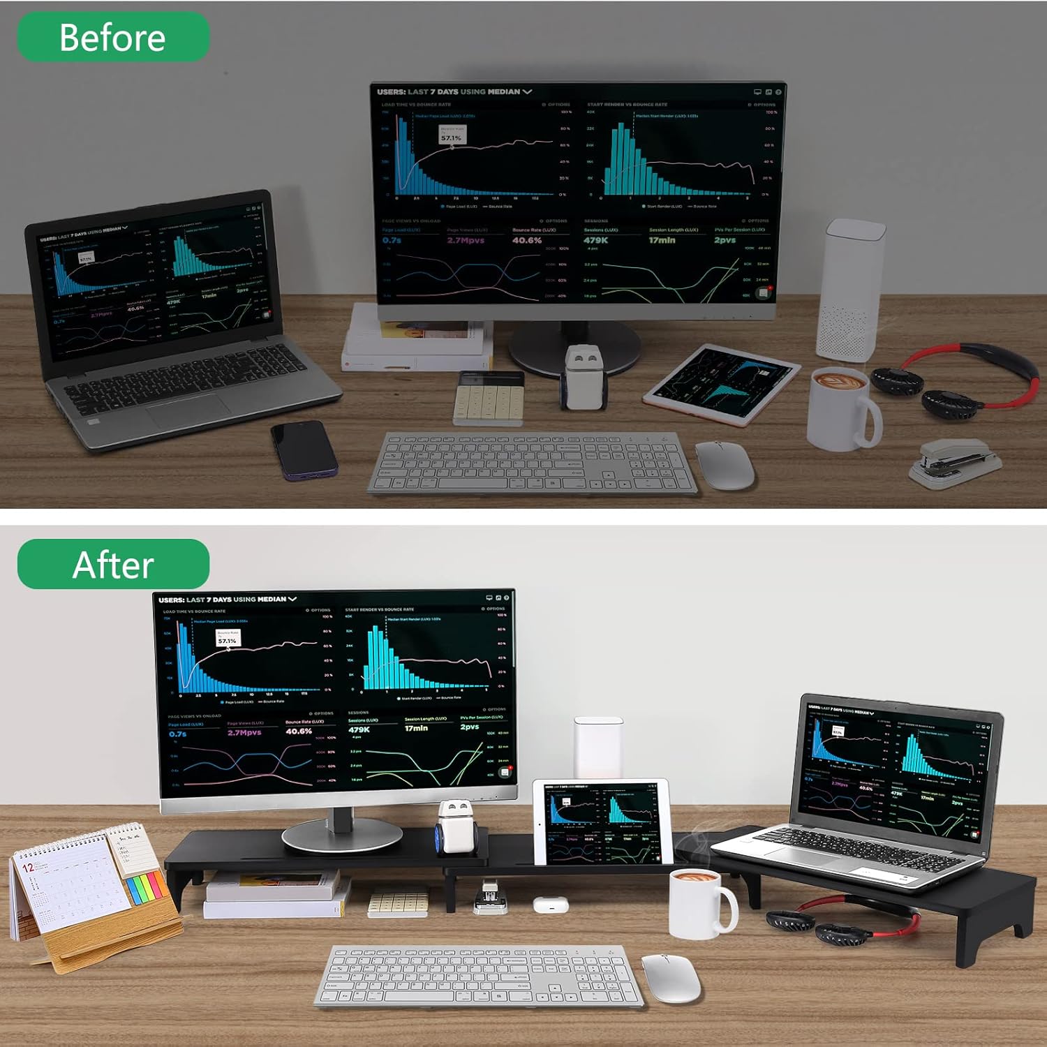 Nnewvante Monitor Stand Riser, 60 inch Large Bamboo Dual Monitor Stand for Desk, 3 Shelves Desktop Screen Riser with Adjustable Length Angle for Computer Laptop PC,Black