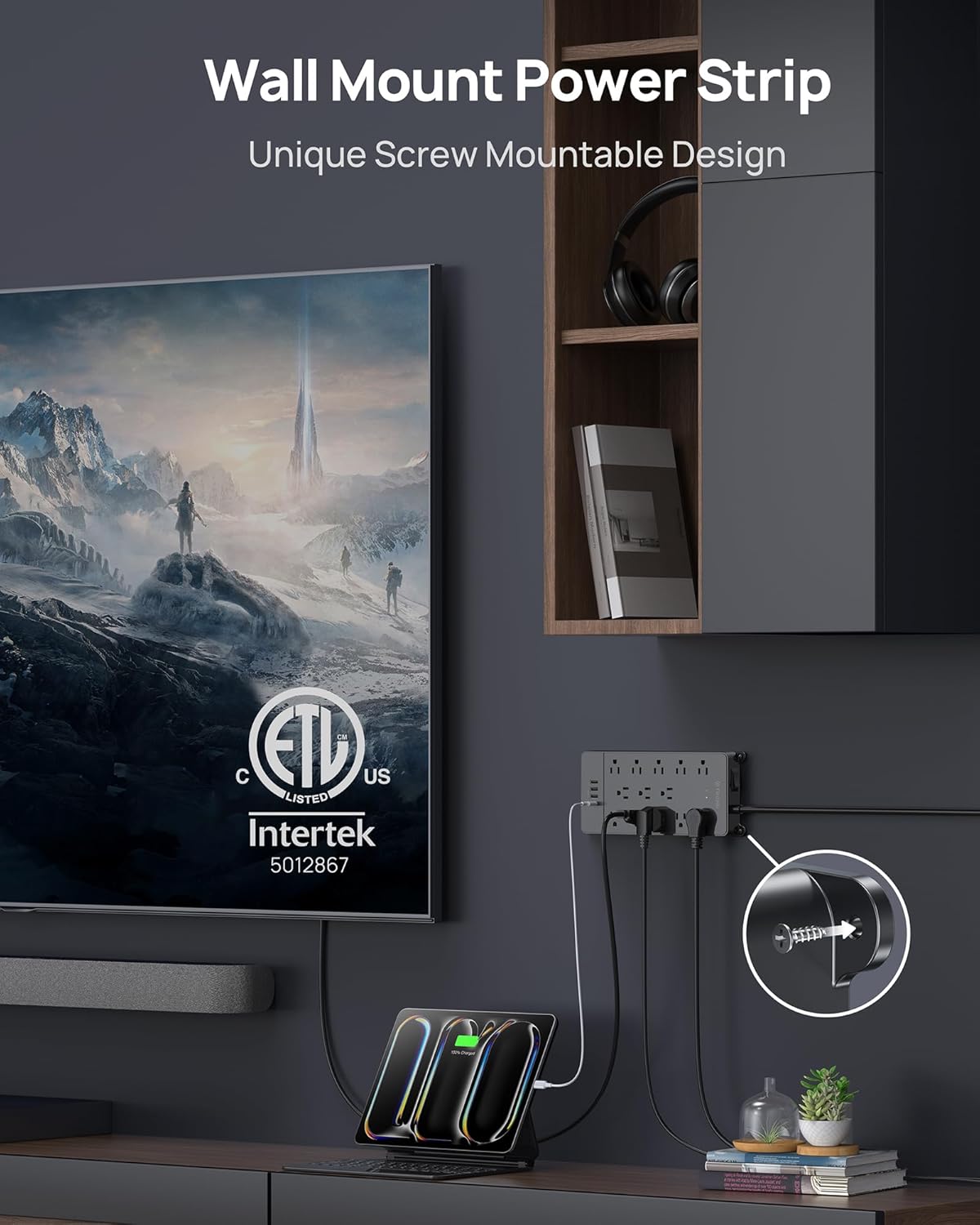 • Wall mountable design - 4 screw-mounting tabs allow you to securely install this surge protector power strip in various applications, including the entertainment center, behind the TV, dorm room, guest room, garage, desktop, under desk/counters, workbenches, etc.