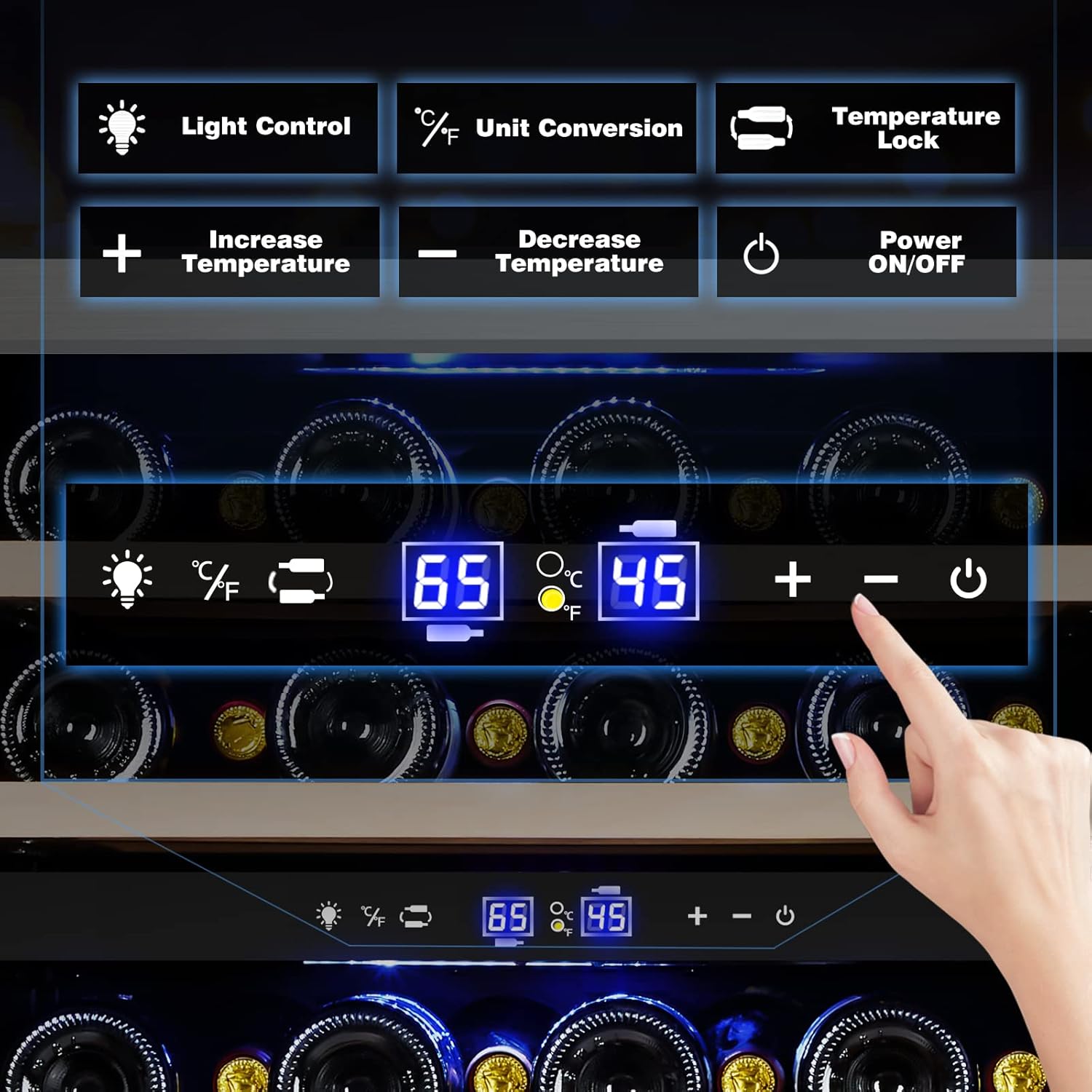 • 【Dual Zone Wine Cooler】This dual zone wine cooler is a unique design that addresses the hassles of storing diverse wine collections, It can accommodate larger bottles, such as Champagne. The upper zone ranges from 40 F to 55 F while the lower zone is between 55 F to 65 F.