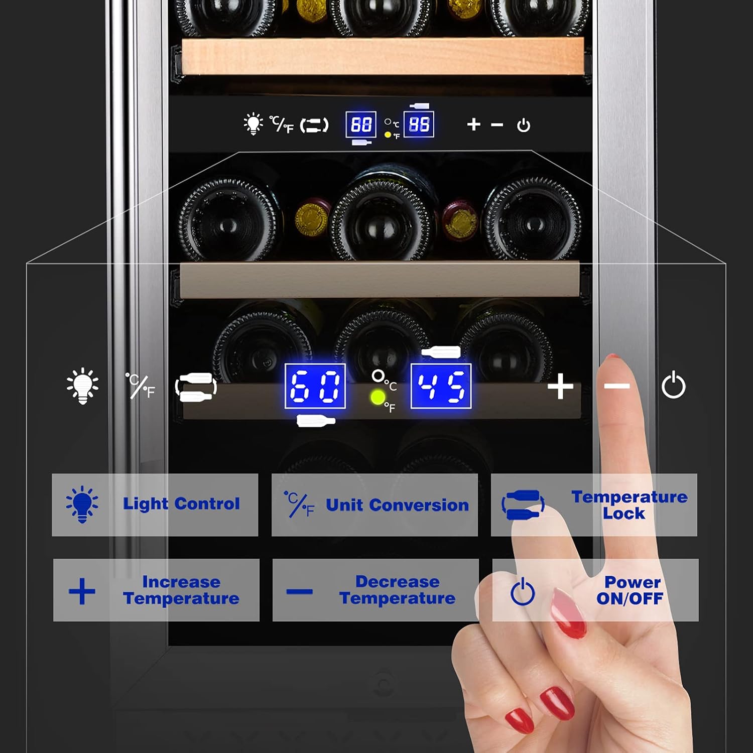• 🍷【Stable Dual Zone Wine Cooler】This 15 inch wine cooler has adopted the dual-zone design of temperature according to the conditions of the wine cellar. Upper zone 40-55°F, lower Zone 55-65°F to make it suitable for storing different wines. There are a thermostat an automatic defrosting function and cold air circulation on this wine cooler refrigerator, which ensures wine fridge keeps a constant temperature setting, and effectively extend and preserve the taste of wine.