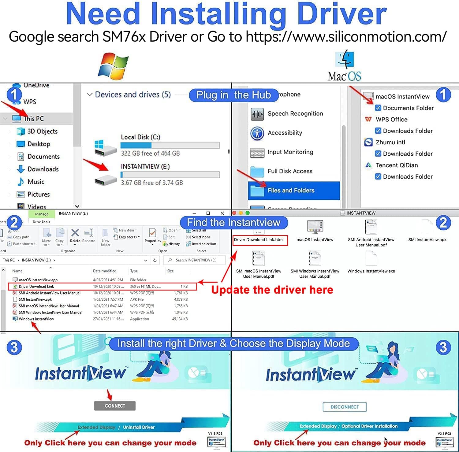• THIS HUB REQUIRES TO INSTALL DRIVER: Please connect the usb 3 docking station and open the "INSTANTVIEW", Check the instructions on the USB flash drive. PLEASE CHECK THE USER MANUAL for your reference. An ideal HDMI dual monitor adapter for MacBook Air/Pro M1 M1 pro M2, iMac/iMac Pro, PS4 Pro, surface Pro, Chromebook Pixel, Dell, ASUS, HP, Lenovo, and more Thunderbolt 3/4 or USB 3.0 laptops