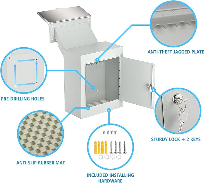 • SECURITY ANTI-THEFT DROP BOX WITH LOCK: POCHAR locking mailbox equipped with a sturdy metal lock can only be accessed with the designated key (come with 2 keys), and cannot be pried open by force. And designed a anti-fishing jagged metal, making it impossible to reach and take out the items inside. And our key drop box provided a rubber mat to reduce moisture and dropping noise.