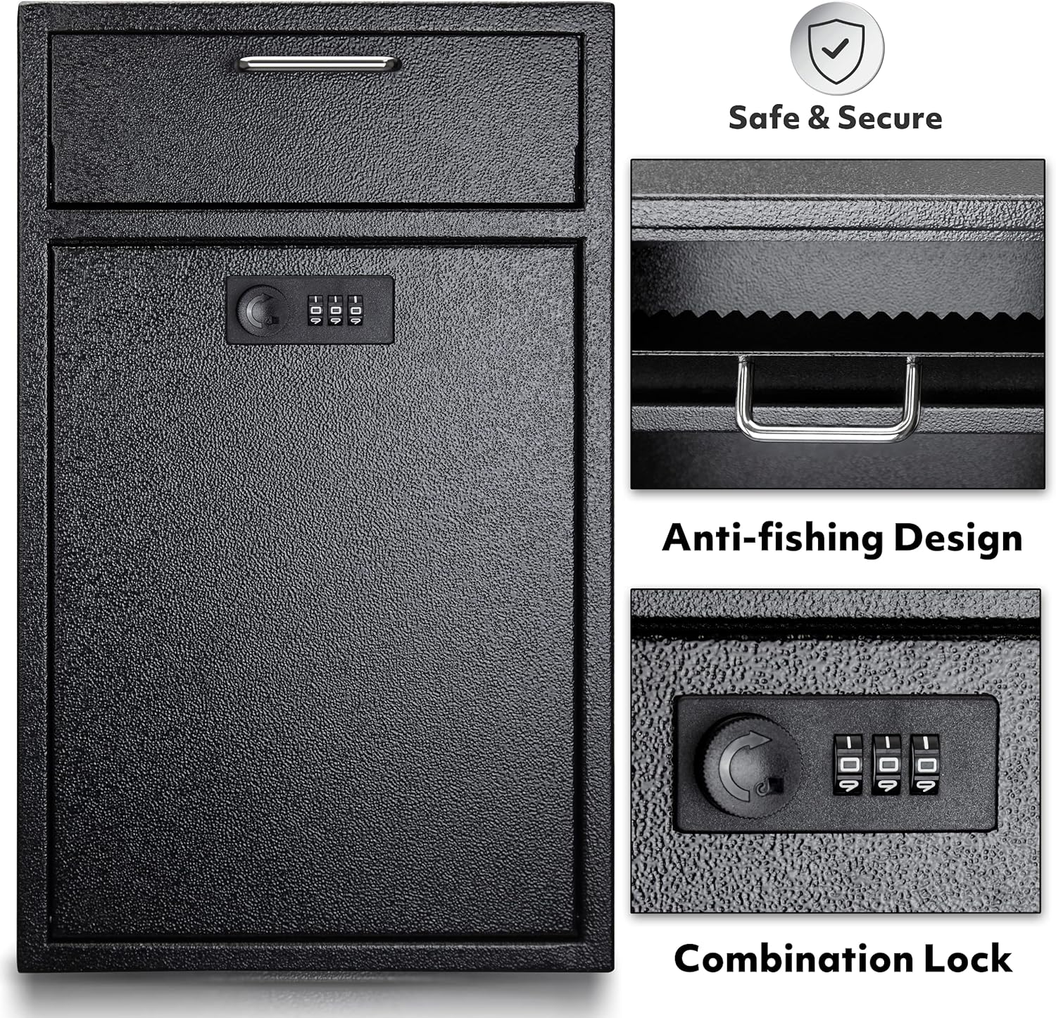 • LOCKED AND ANTI-THEFT: This security dropbox comes with a built-in combination lock, and the anti-fishing design inside makes it impossible for unauthorized personnel to take out the items. Our deposit box with lock will keep your private and important goods safe and secured.