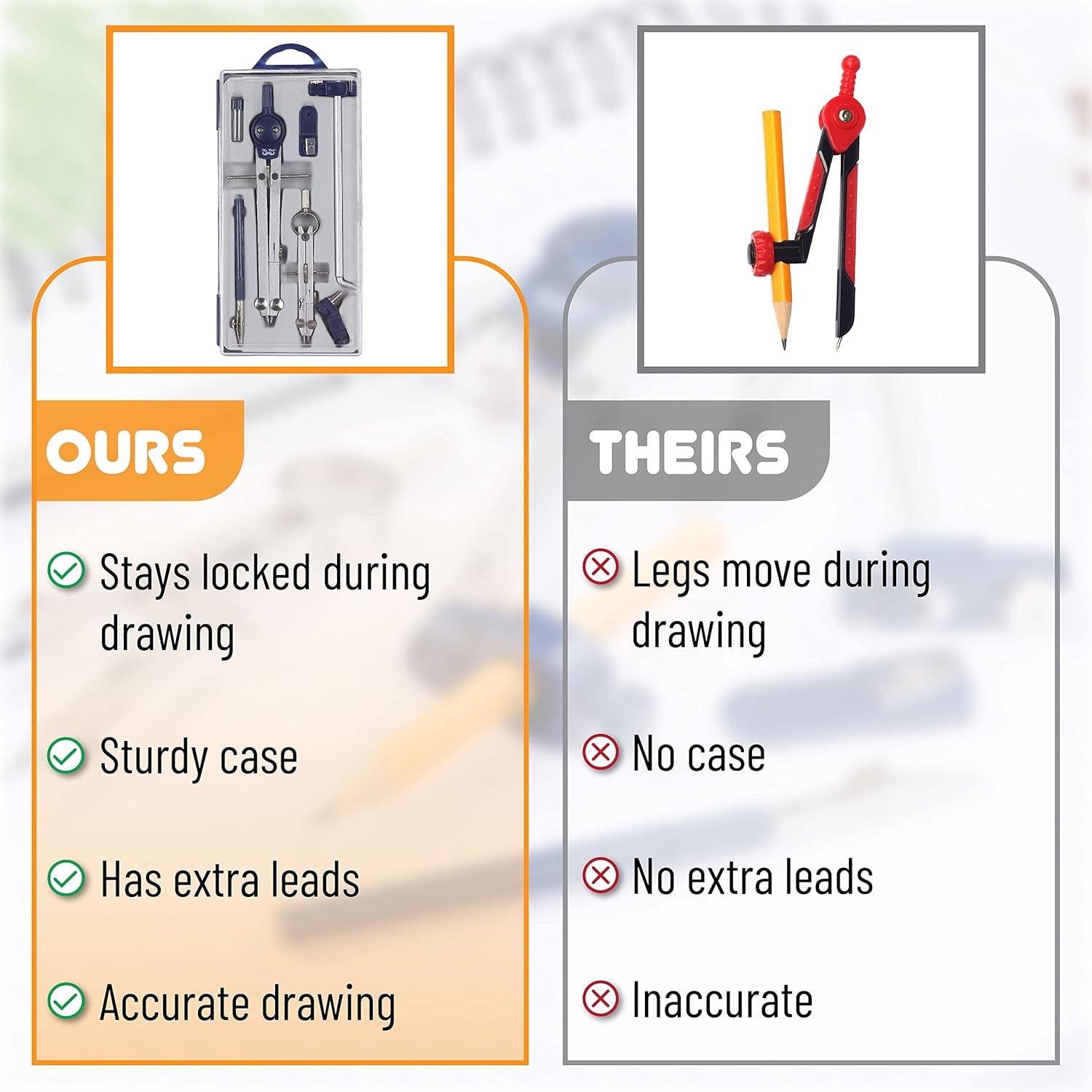 • Precision geometry compass with spring bowhead and center wheel prevents unintentional leg movements