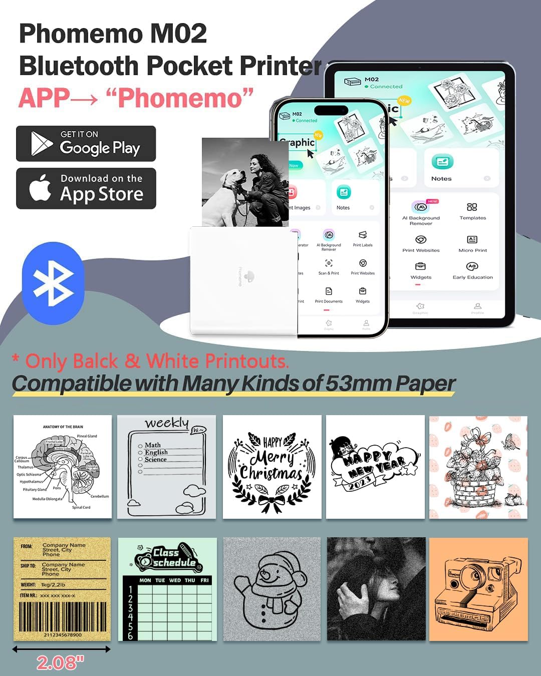 • Bluetooth Mini Thermal Printer- for cell phones and tablets with Bluetooth connectivity, compatible with Android 7.0 and iOS 13.0 or above.The Phomemo M02 sticker printer machine is an inkless wireless printer, you don't need any ink or toner. Not only is it suitable for white self-adhesive and thermal paper (only black and white colors can be printed), but it can also print patterns and text on colored and transparent paper rolls (special paper rolls can be printed in a single color)
